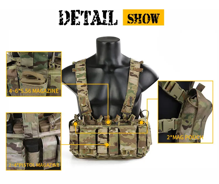Este producto adopta el diseño con la capacidad de carga como requisito principal.El cuerpo principal puede transportar de 4 a 6,56 cargadores, 2 a 4 cargadores de pistola y dos bolsas diversas suficientes para acomodar el walkie-talkie.Este producto está equipado con un juego de suspensión H y una correa para la cintura, que se puede montar y desmontar según las necesidades individuales.La configuración original es suficiente para satisfacer las necesidades de los juegos generales de airsoft.Por ejemplo, se puede cargar con chalecos tácticos como APC después del desmontaje.