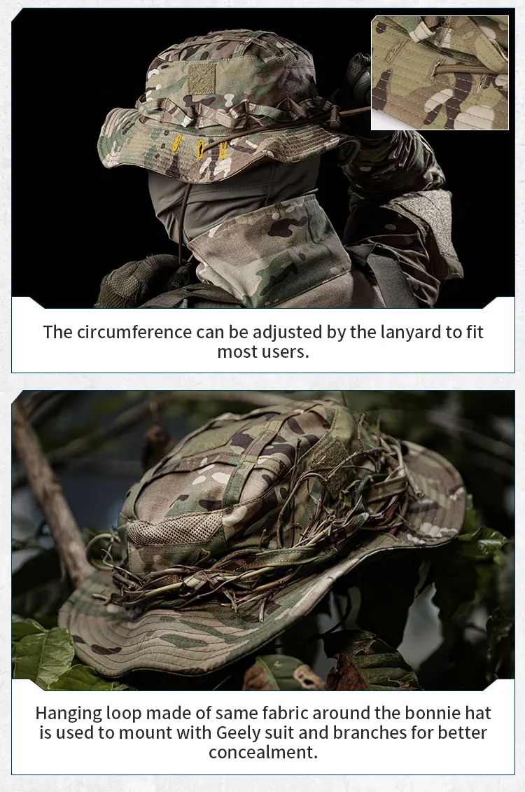 4. Multifuncional: El lazo para colgar, confeccionado con la misma tela que el gorro bonnie, se utiliza para sujetarlo al traje Geely y a las ramas, ofreciendo un mejor camuflaje.En el uso diario, estos lazos también añaden un estilo diferente al sombrero.