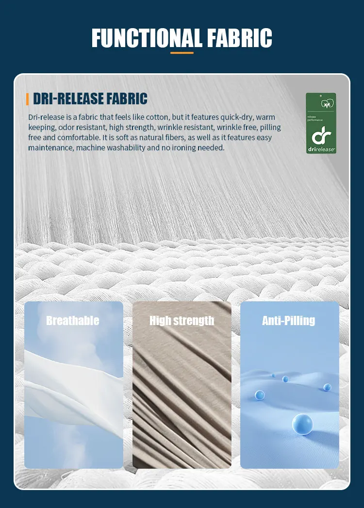 Material del cuerpo: Dri-release es una tela que se siente como algodón, pero se seca rápidamente, mantiene el calor, es resistente a olores, de alta resistencia, resistente a las arrugas, sin arrugas, sin pelusas y cómoda.Es suave como las fibras naturales y presenta fácil mantenimiento, se puede lavar a máquina y no necesita planchado.La tela de liberación de goteo utiliza completamente las excelentes características del algodón y el poliéster, y su sistema de absorción de humedad puede absorber y transferir oportunamente el sudor de la piel a la superficie de la tela y liberarla al aire.