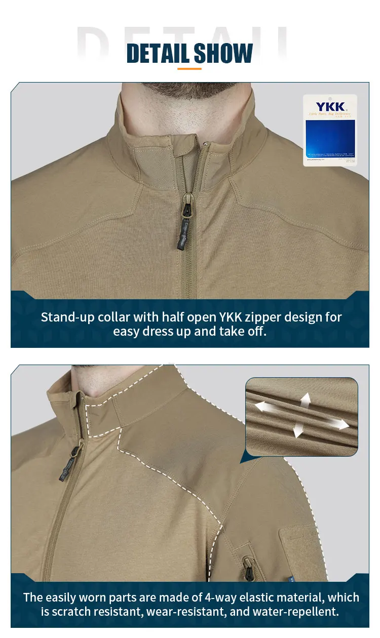 Material de hombros y mangas: las piezas que se desgastan fácilmente están hechas de material elástico de 4 direcciones, que es resistente a los arañazos, al desgaste y repelente al agua.
