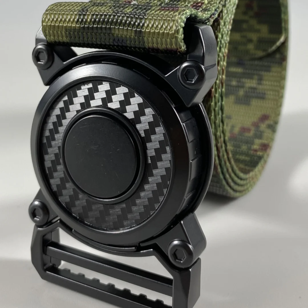 El cinturón cuenta con cierres giratorios de aleación de plomo y cuerpo de correa de nailon de camuflaje digital EMR.