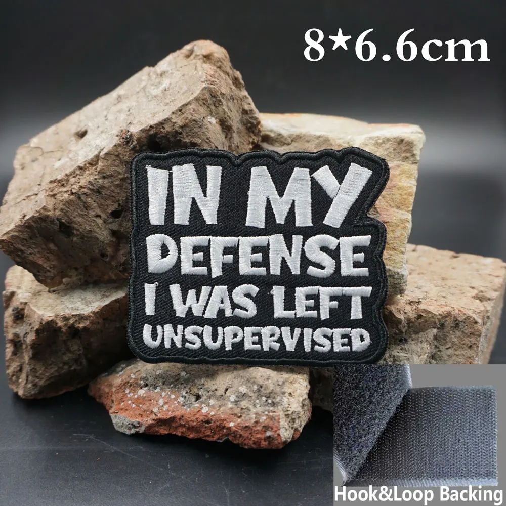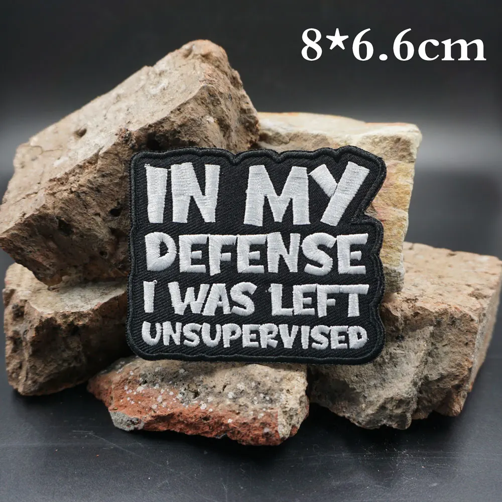 EN MY DEFENSE I WAS LEFT, parches bordados sin supervisión, apliques, etiqueta de costura, banda de motociclista punk, insignia de ropa de Rock