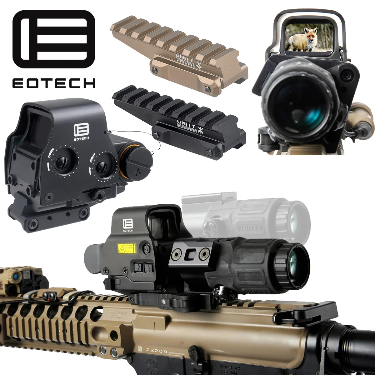 A prueba de golpes y intemperie, fácil de configurar, se adapta a cualquier riel de 20 mm.