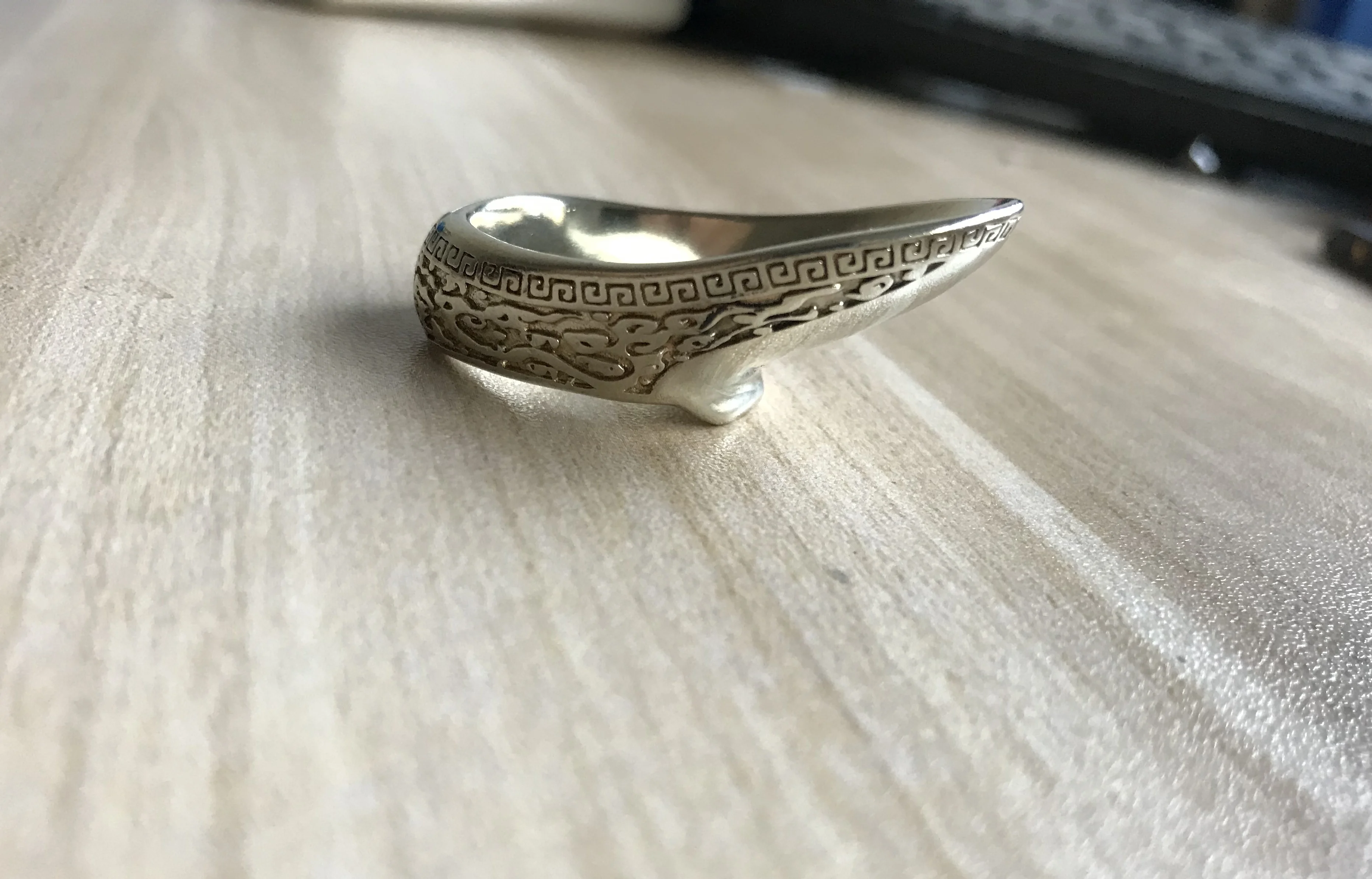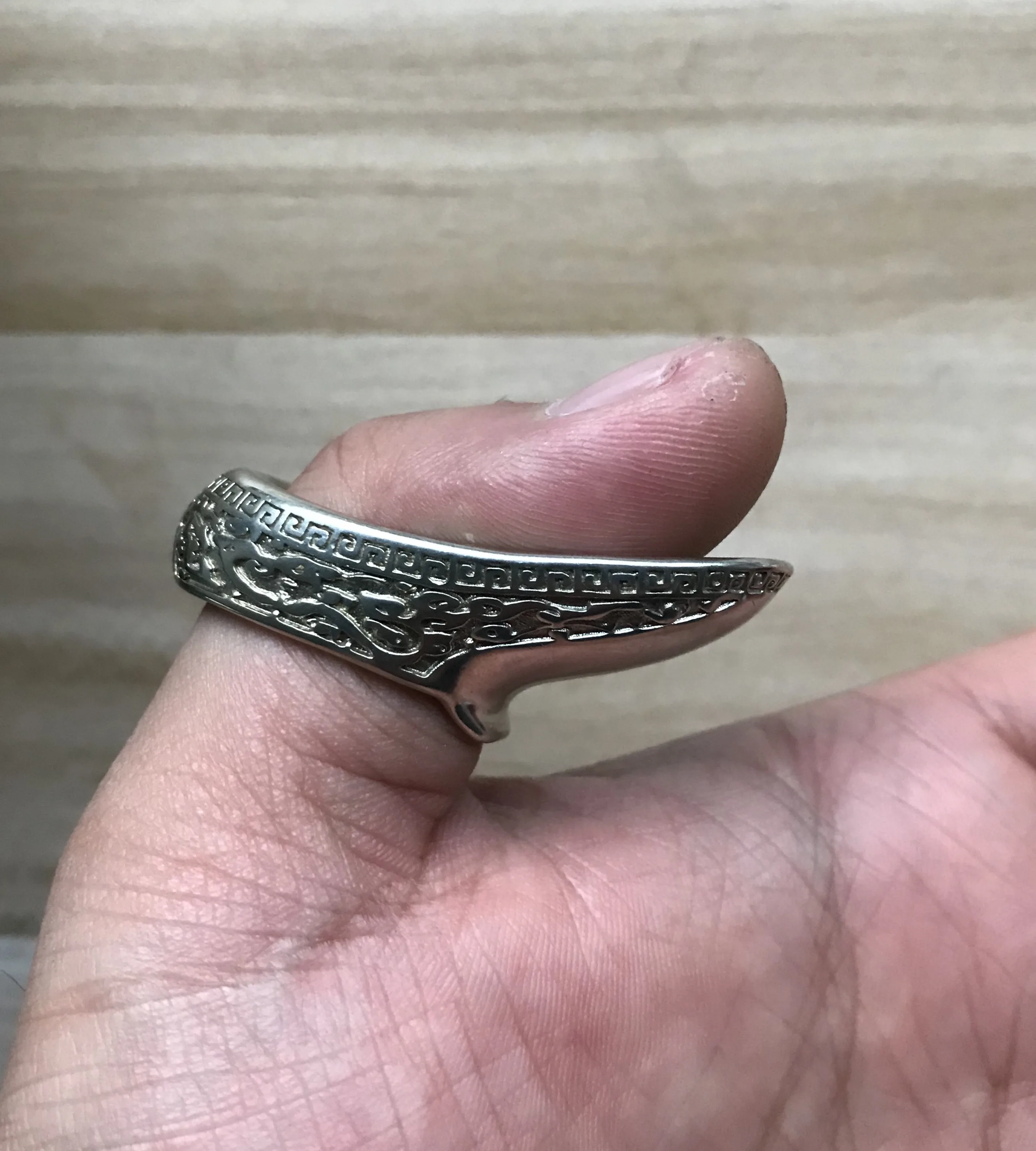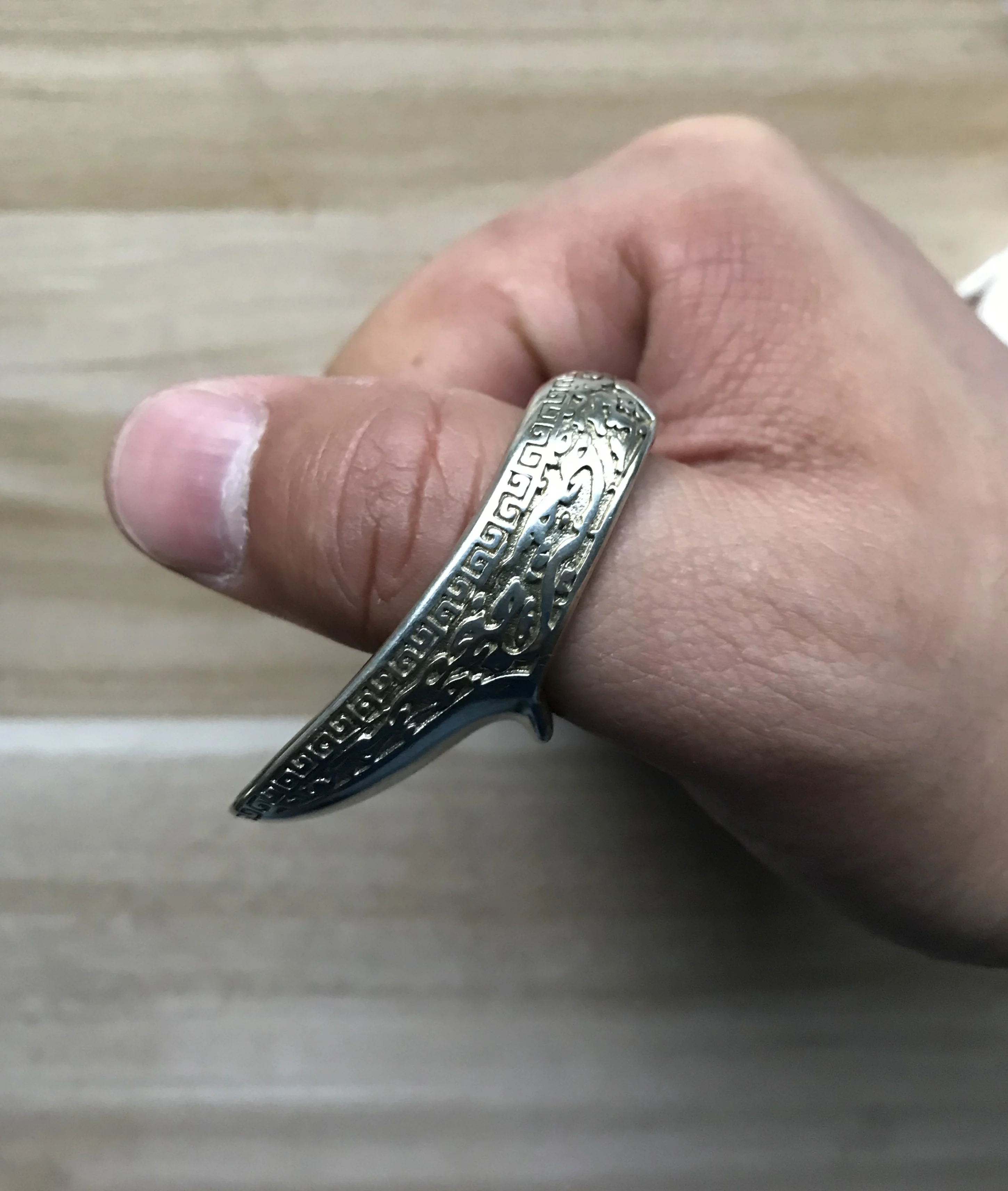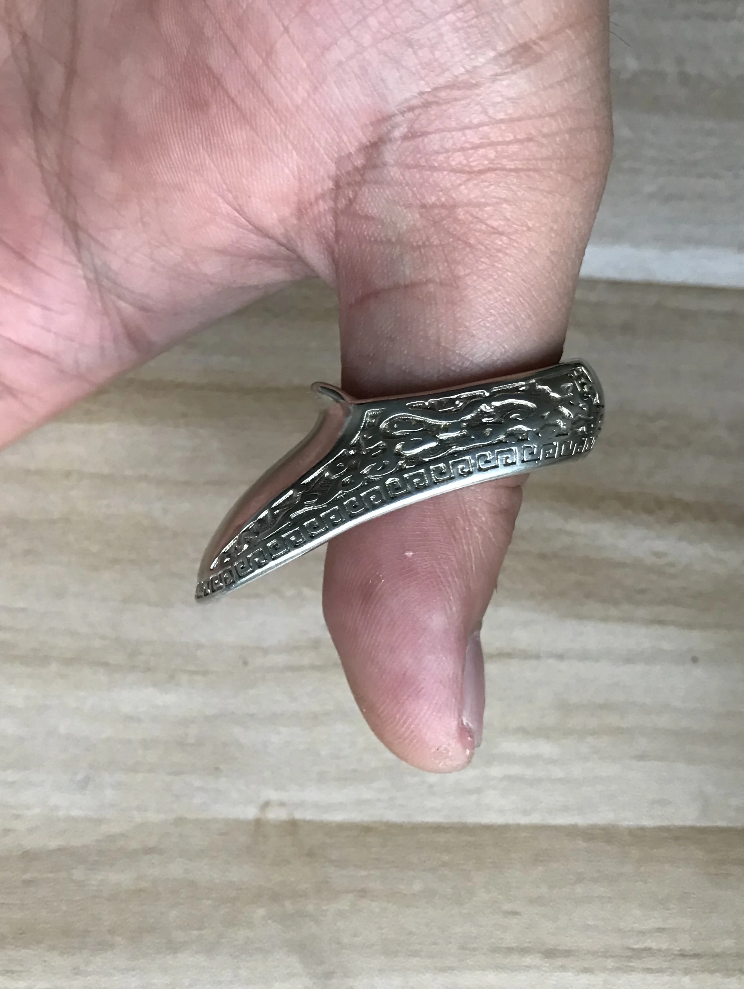 La forma correcta de usar la flecha es presionar la uña del pulgar con el dedo índice, y después de tirar de la cuerda, la pendiente del anillo para el pulgar engancha la cuerda a unos 45 grados. La forma correcta de soltar la flecha es dejar que la cuerda se deslice hacia afuera a lo largo de la pendiente del anillo del pulgar.