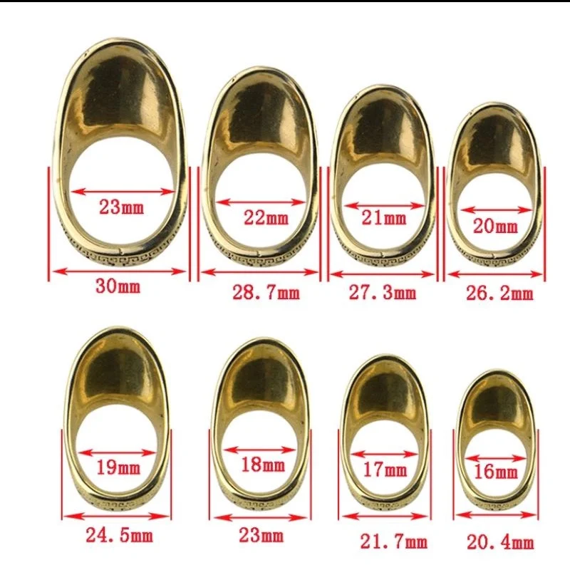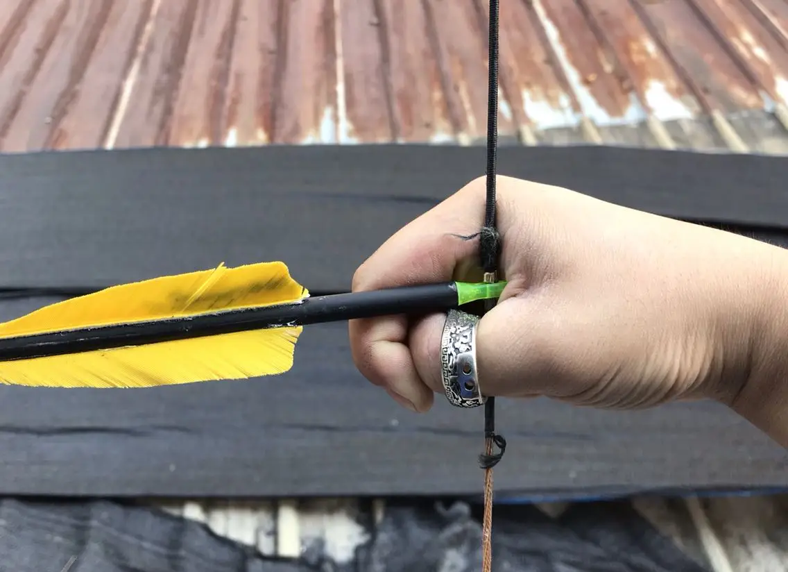 La forma correcta de usar la flecha es presionar la uña del pulgar con el dedo índice, y después de tirar de la cuerda, la pendiente del anillo para el pulgar engancha la cuerda a unos 45 grados. La forma correcta de soltar la flecha es dejar que la cuerda se deslice hacia afuera a lo largo de la pendiente del anillo del pulgar.