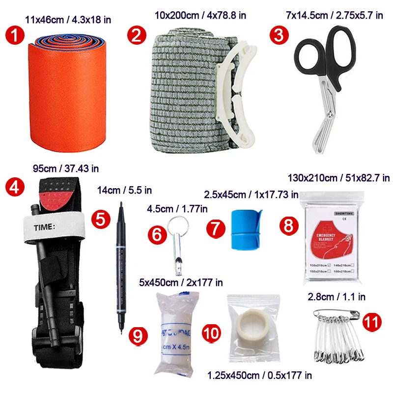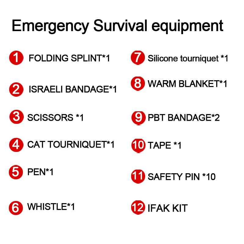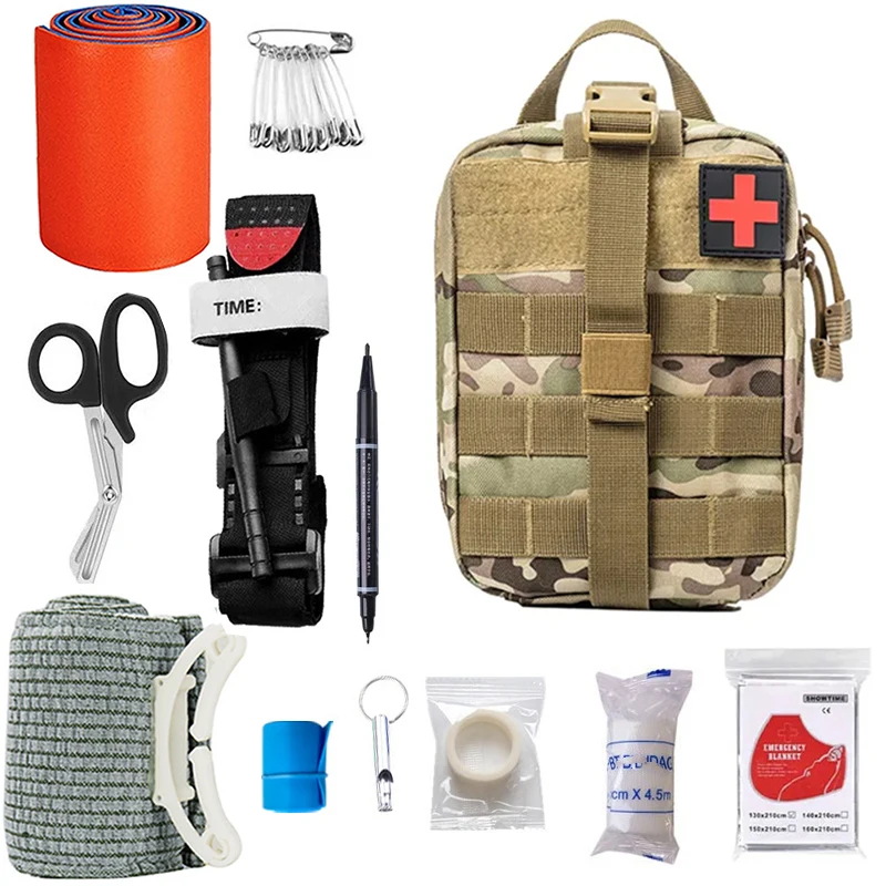 Equipo de supervivencia al aire libre, bolsa Molle, botiquín de primeros auxilios de emergencia, torniquete, vendaje israelí, mantas de acampada, silbato