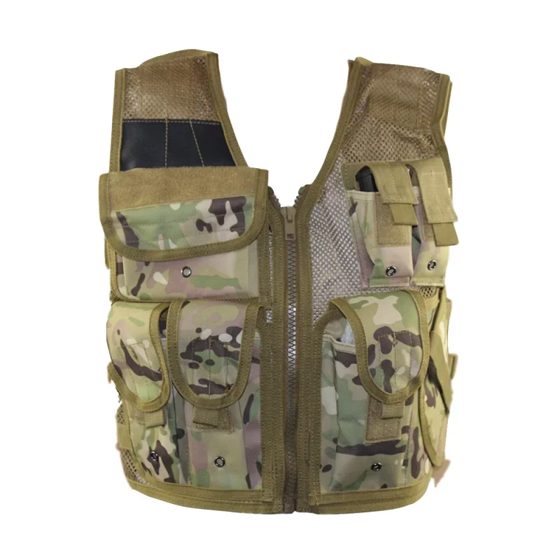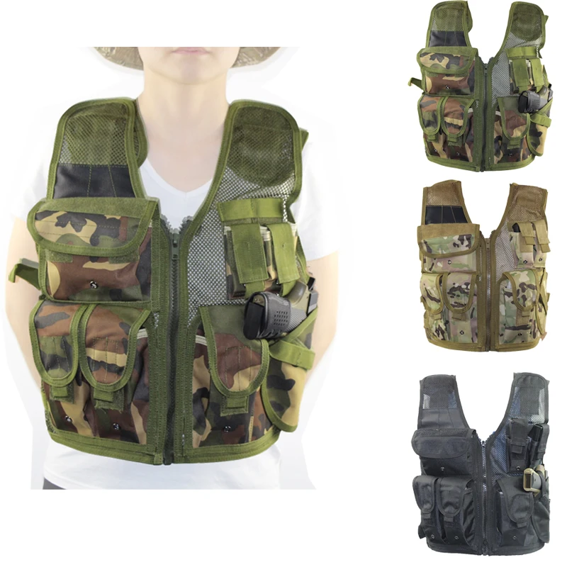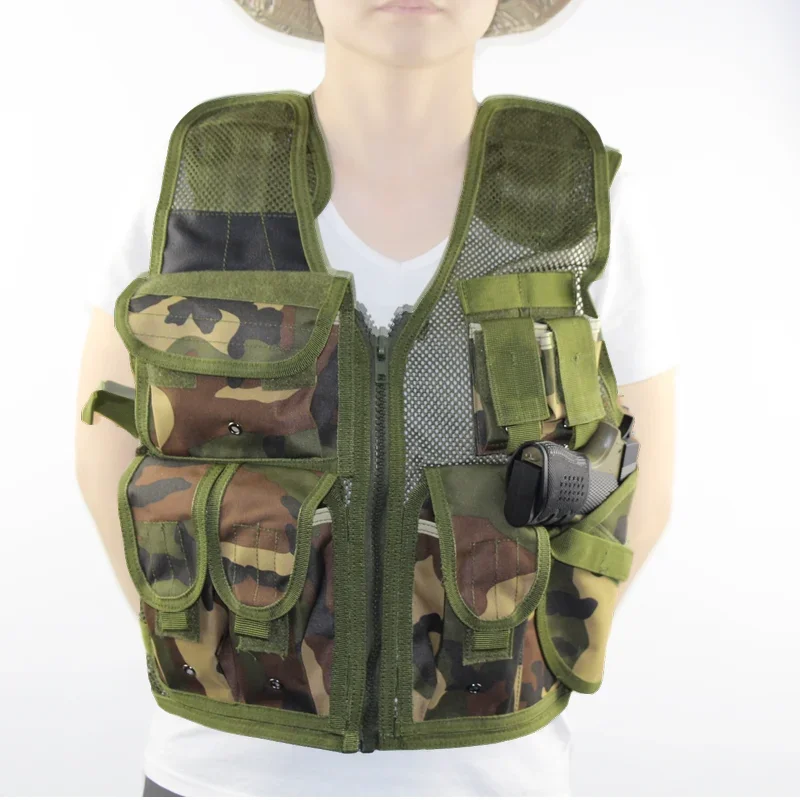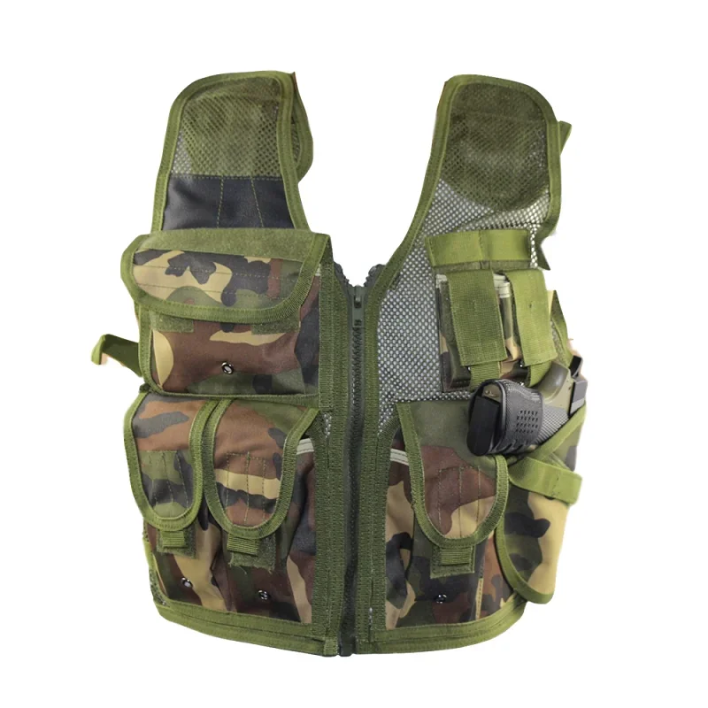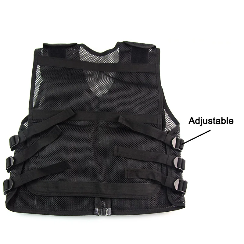 1. Made by high quality nylon and polyster material.2. Quick release zipper for wearing.3.The whole pieces with nylon mesh cloth manufacturing4. 6 Small Magazine Pouches in the front5. 1 Gun Holster Pouch6. Size Adjustable