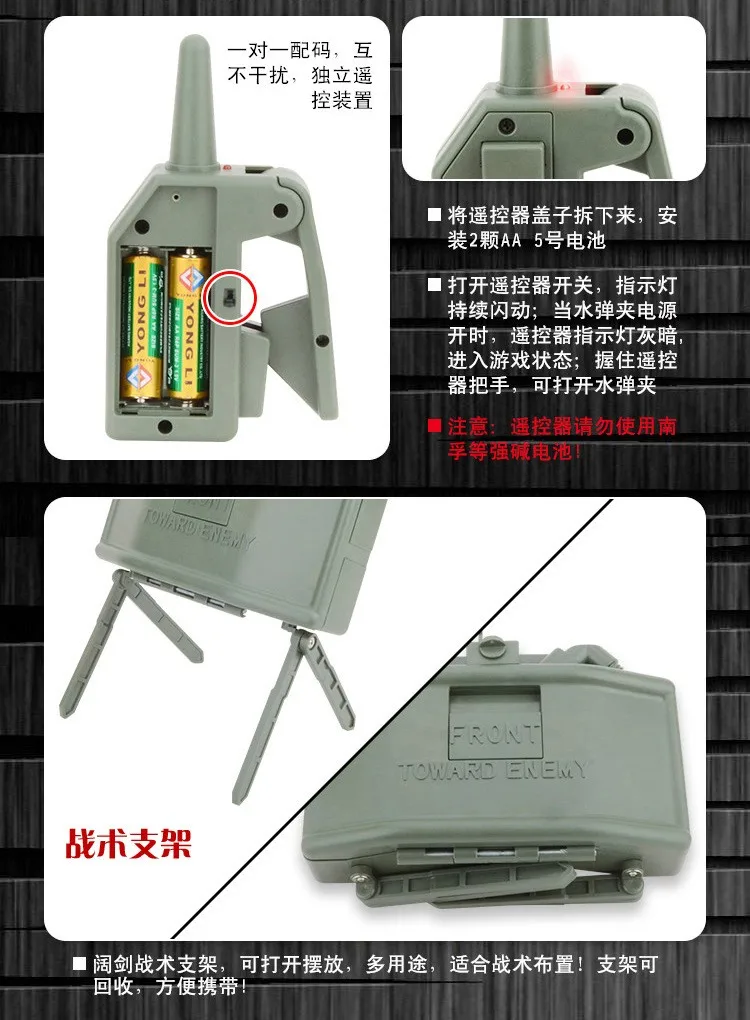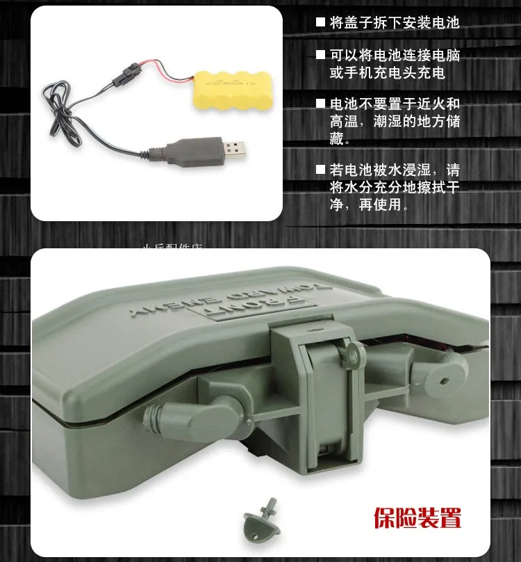 ... La batería recargable incorporada de 4,4 V y 700mAh y la interfaz USB hacen que la bomba de cuentas de agua se pueda conectar con el enchufe de carga de la computadora o el teléfono para cargar; La batería debe protegerse del fuego, el calor y la humedad, si la batería está mojada por agua, limpie bien el agua y luego úselo; El control remoto debe usarse con 2 pilas AA (no está equipado, Prepárelo usted mismo).