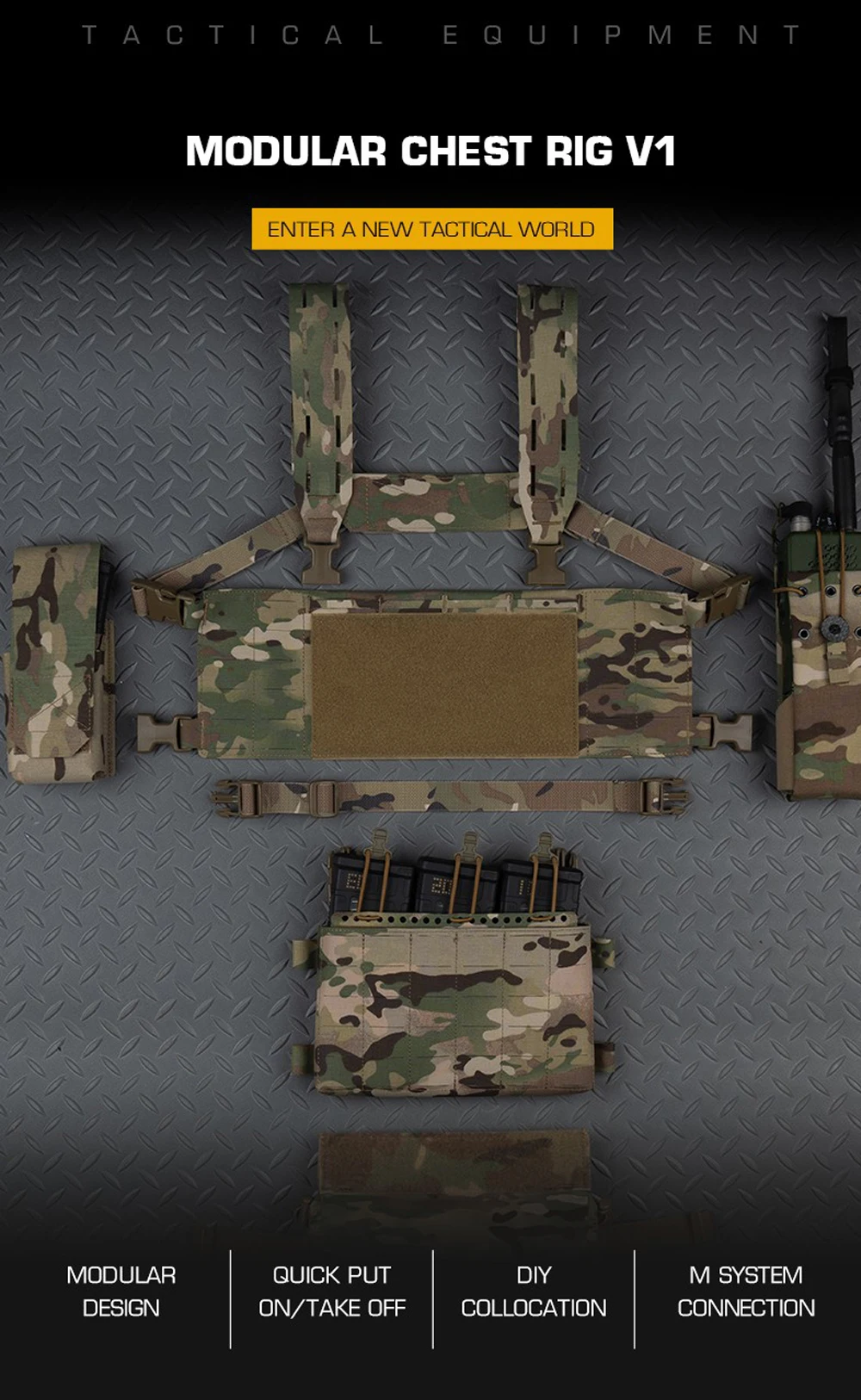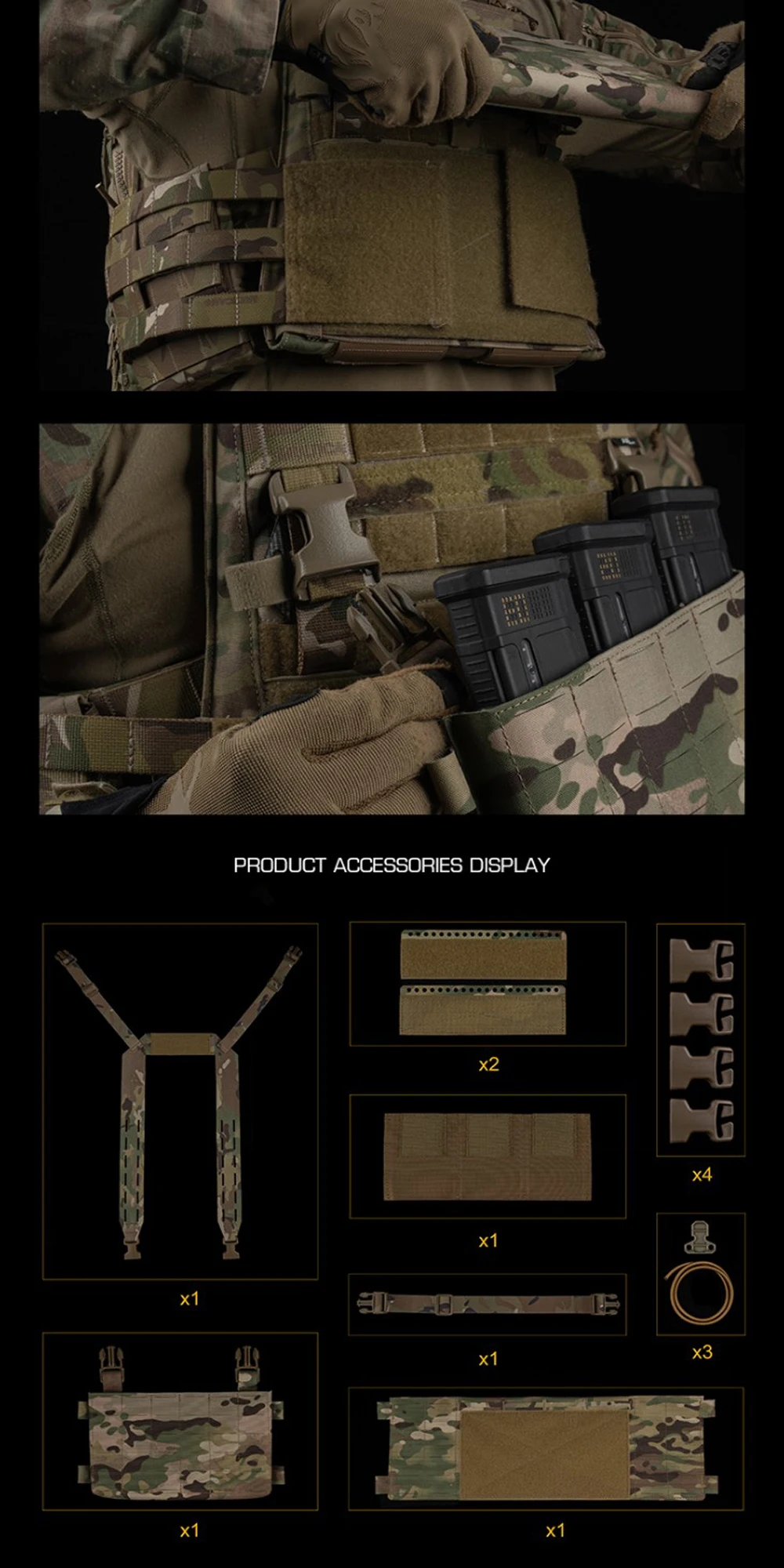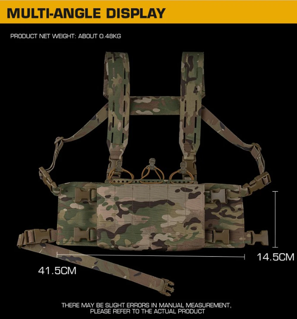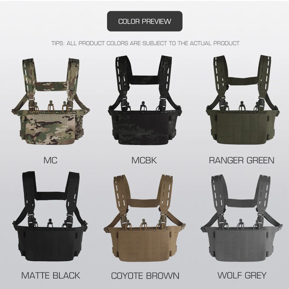 Nombre del producto: aparejo de pecho modular V1 Número de artículo.:VE-112 Tamaño del producto: 26*18*6CM Peso neto del producto: 0,48 KG Peso bruto del producto: 0,508 kg. Color del producto: negro mate/marrón coyote/verde racer/gris lobo/MC/MCBK. Material principal: Cordura Escena aplicable: caza, deportes al aire libre y otros accesorios tácticos de atletismo Airsoft CS, etc.