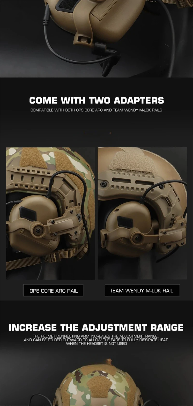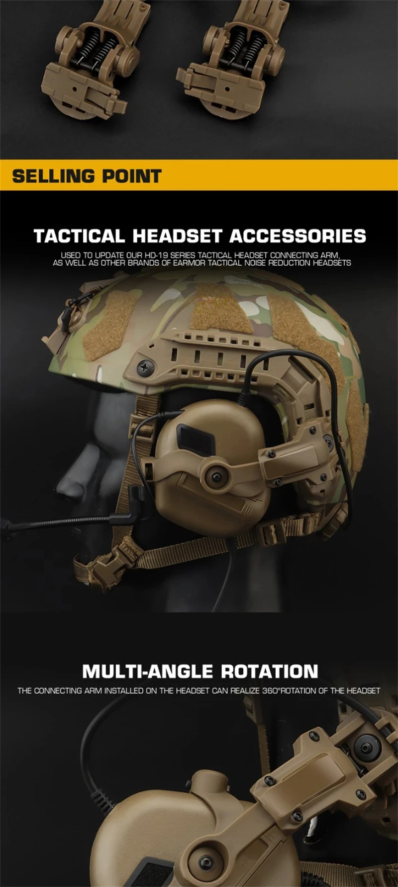 Característica del producto: 1. Accesorios para auriculares tácticos. Se utilizan para actualizar nuestro brazo de conexión de auriculares tácticos de la serie HD-19 y otras marcas de auriculares tácticos con reducción de ruido E ARMOR. 2. Rotación multiángulo, el brazo de conexión instalado en el auricular puede realizar 360° rotación del auricular. 3.Configure dos tipos de rodajas de transferencia, aplicable a las especificaciones OP SCore ARC y a las especificaciones Team Wendy M-LOK 4. Aumente el rango de ajuste. El brazo de conexión del casco tiene un amplio rango de ajuste.Cuando no se utiliza el auricular, se puede girar hacia afuera para disipar completamente el calor del oído. 5. Diseño de ajuste de escaldado, la longitud flexible del brazo de conexión del casco permite a los usuarios usar auriculares, ajustable a una posición cómoda