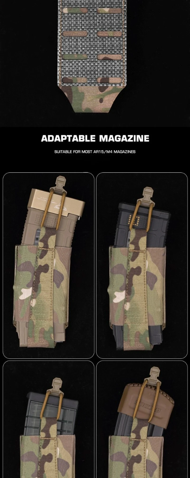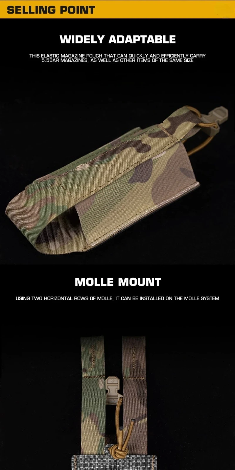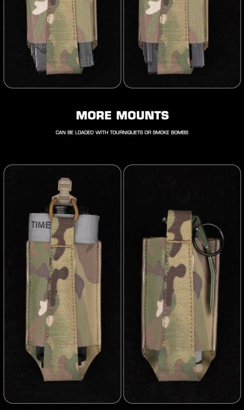Característica del producto: 1.Ampliamente adaptado, una bolsa con función elástica que puede transportar rápida y eficazmente la caja de función 5.56AR u otros artículos del mismo tamaño. 2.Montaje MOLLE, se pueden instalar dos líneas de MOLLE en el sistema MOLLE. 3. Caja de funciones adaptable, se adapta a la mayoría de las cajas de funciones 5.56AR 4.Más soporte.Se puede cargar con torniquetes o accesorios de humo. 5.Escena aplicable: actividades de equipos, juegos tácticos, accesorios de películas.