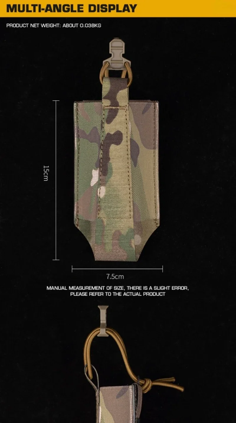 Información del producto: Nombre del producto: Bolsa Molle elástica individual de 5,56/7,62 mm Marca del producto: ERQYGRA Tamaño del producto: 15x7,5 cm Peso neto del producto: 0,038 kg