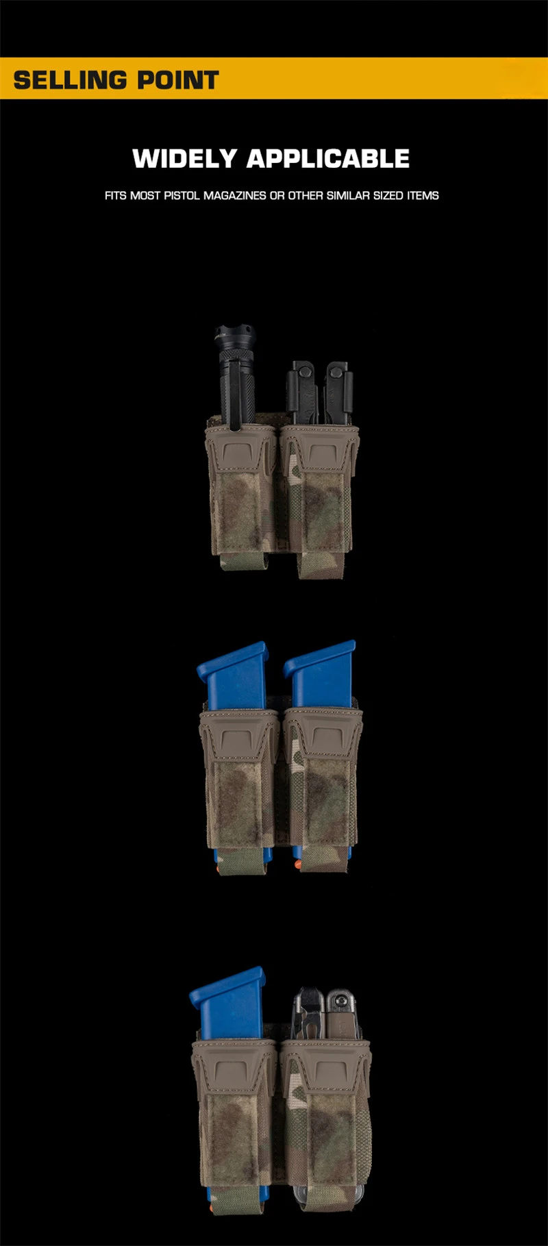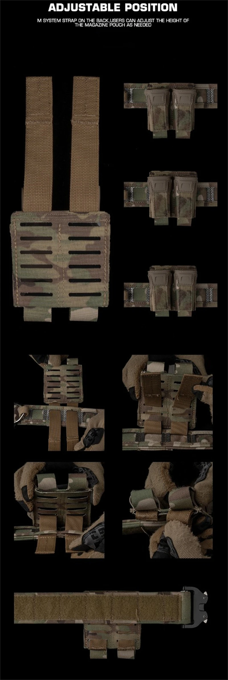 Product Feature: 1. Wide adaptability, compatible with various small function boxes or similar sized objects 2. Different uses, 2 uses, users can remove the package cover as needed and use it as an open function package 3. Multi stage height adjustment, with M system webbing on the back, allowing users to adjust the height position of the functional package according to their usage habits