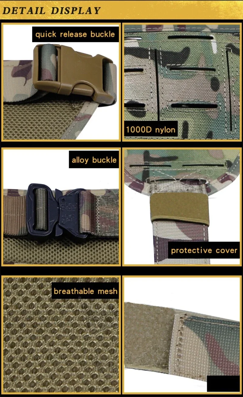 Información del producto: Nombre del producto: faja táctica para cintura. Marca del producto: ERQYGRA Longitud del producto: 43*50 cm Peso neto del producto: 0,66 kg Accesorios del producto: cinturón uno Color del producto: BK, OD, T, CP Material principal: nailon 1000D