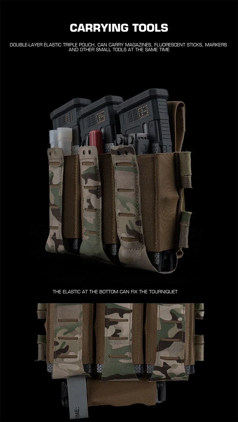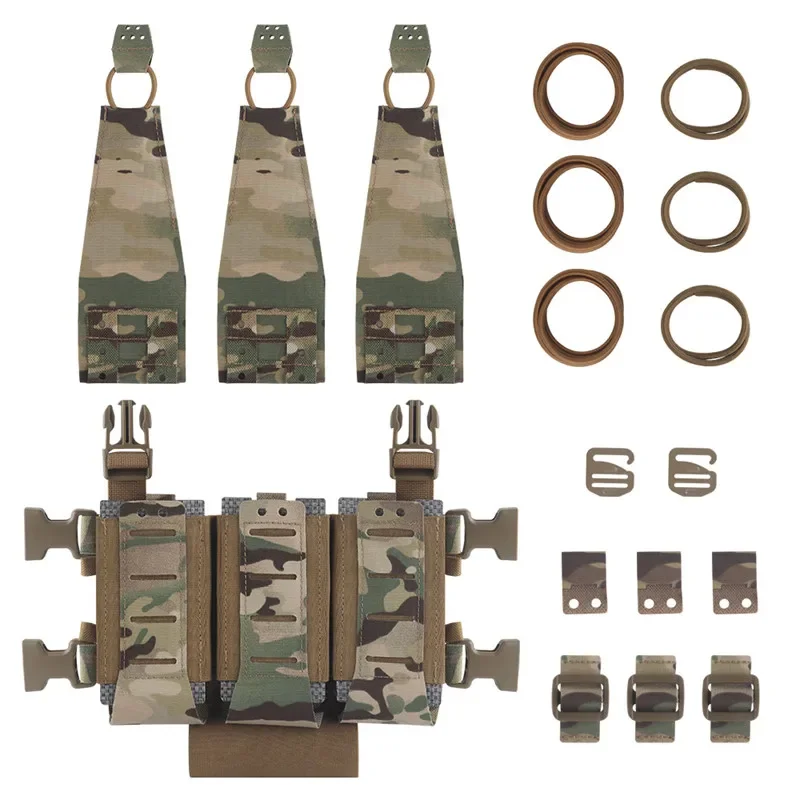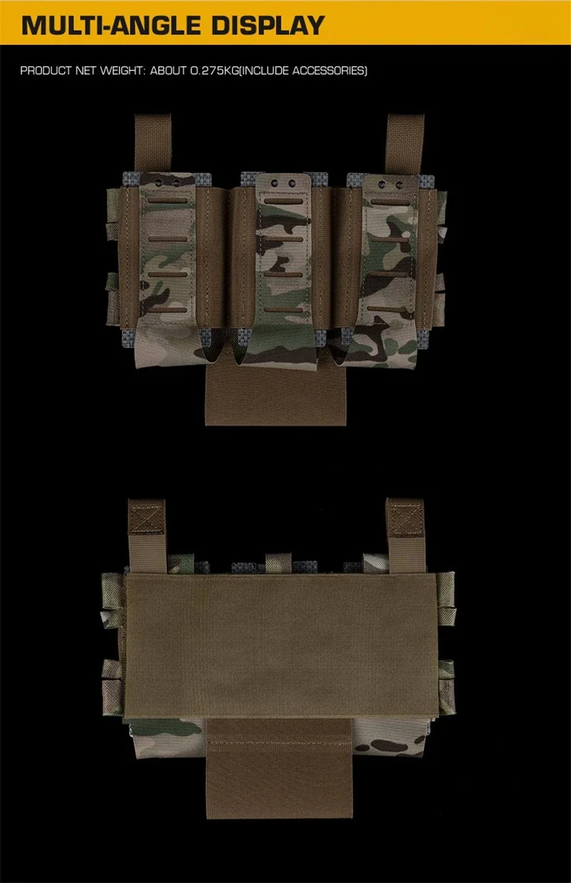 Característica del producto: 1.Ampliamente aplicable, compatible con varias cajas de funciones 5.56, se puede usar como cuerpo de bolsa elástica y se puede usar como bolsa de equipo abierta. 2.Inserción rápida, el paquete viene con una placa de sujeción curva hacia afuera para una inserción fácil y rápida en la caja funcional. 3.Lleve herramientas, bolsa triple elástica de doble capa, puede transportar cajas de funciones y herramientas pequeñas como palos fluorescentes y marcadores al mismo tiempo. 4.Bolsa para equipo de triple carga.Cuando la bolsa elástica trasera no está en uso, la bolsa elástica delantera se puede utilizar como bolsa para equipo de carga triple. 5.Se puede utilizar en combinación con otros subpaquetes tácticos con sistema M. 6.Asa de cuerda elástica, utilice la cuerda elástica y el asa incluidas para asegurar los artículos dentro de la bolsa. 7.La funda de la bolsa se puede reemplazar y los usuarios pueden quitar la cuerda elástica para reemplazar la funda de la bolsa según sus necesidades. 8.Accesorios de hebilla intercambiables, la hebilla puede ser compatible con la mayoría de los chalecos tácticos o usarse como colgador de pecho (las correas de suspensión de pecho deben comprarse por separado) 9.El accesorio de hebilla G se puede reemplazar y los usuarios pueden usar la hebilla G para montarlo en ganchos/chalecos tácticos para el pecho. 10.Dispositivo de liberación rápida, ambos lados pueden equiparse con accesorios de liberación rápida y chalecos tácticos para su uso (los accesorios de liberación rápida deben comprarse por separado) Tenga en cuenta: 1. Debido a la medición manual, habrá un error de 1-3 cm. 2. El color puede ser más claro o más oscuro debido a las diferentes pantallas de PC. 3.Tal vez haya una ligera diferencia en los detalles y el patrón.