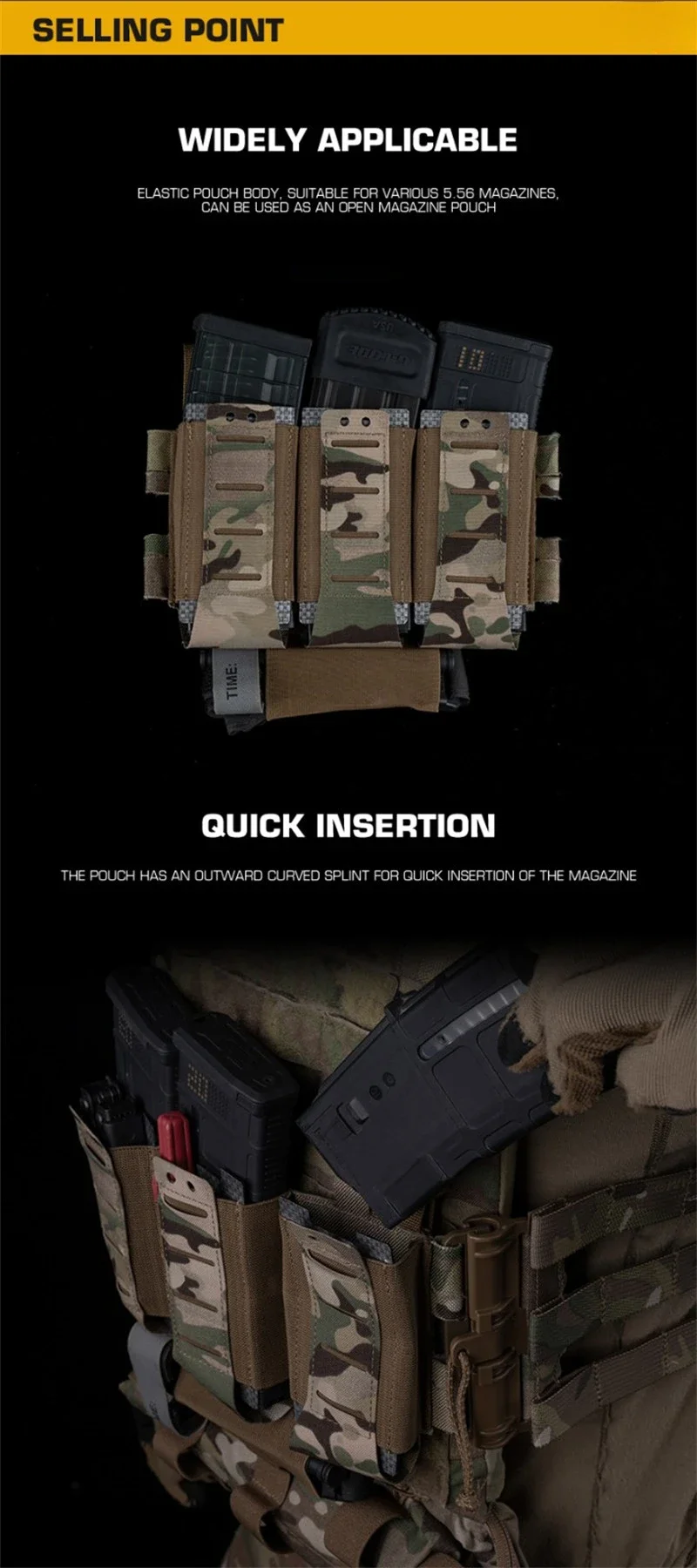 Información del producto: Nombre del producto: Bolsa táctica triple Mag 5.56 Tamaño del producto: 24x18x2,5 cm Marca del producto:ERQYGRA Peso neto del producto: 0,275 kg Material principal: nailon/tela matizada. Escena aplicable: actividades de equipos, juegos tácticos, accesorios de películas.