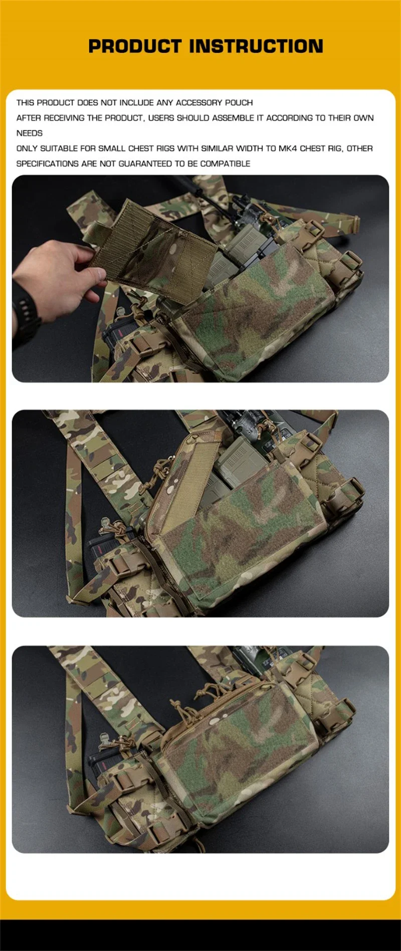 Información del producto: Nombre del producto: chaleco táctico MK4 con bolsa de pecho Marca del producto: ERQYGRA Tamaño del producto: 21,5*7*1.7 cm Peso neto del producto: 0,035 kg Color del producto: negro mate/gris lobo/verde Ranger/marrón coyote/multicam/multicam negro Escena aplicable: actividades de equipos, juegos tácticos, accesorios de películas. Material principal: nailon/tela matizada.
