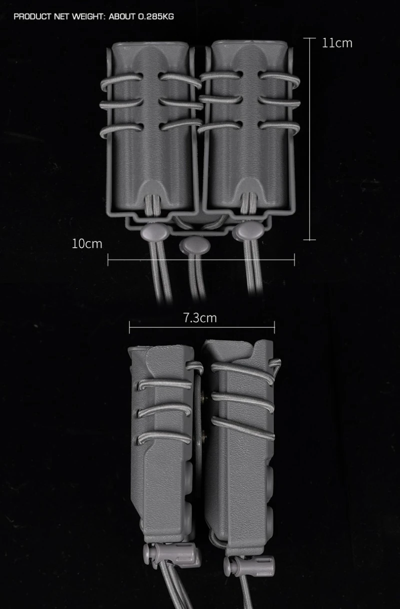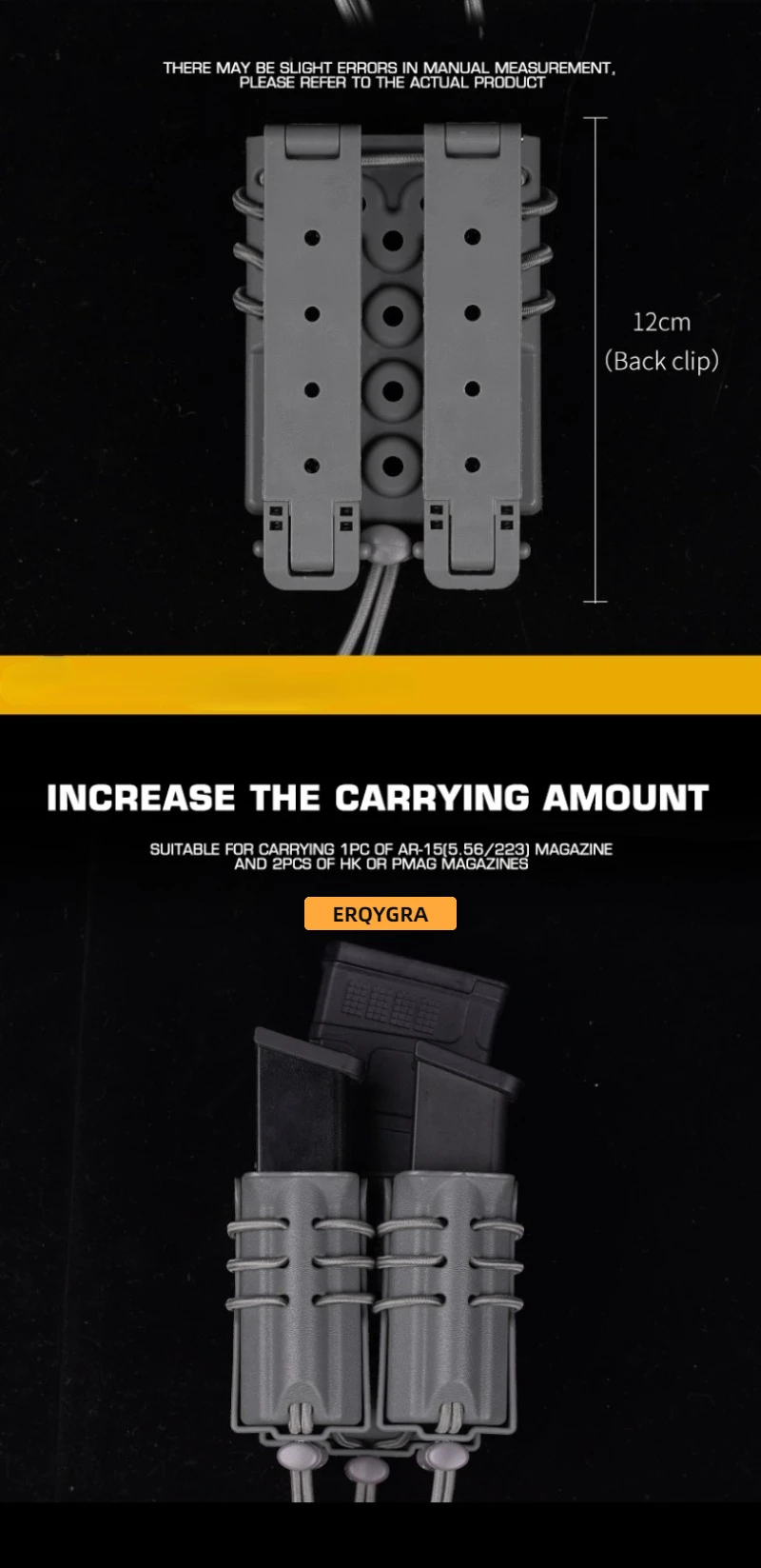 Información del producto: Nombre del producto: Bolsa Molle urbana M4 de doble mag de 9 mm Marca del producto: ERQYGRA Tamaño del producto: 11x10x7,3 cm Peso neto del producto: 0,285 kg Material principal: nailon Escena aplicable: actividades de equipos, juegos tácticos, accesorios de películas.