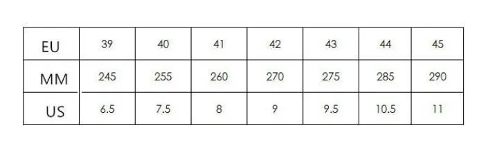 1. El TAMAÑO de EE. UU. o el TAMAÑO de la UE pueden ser diferentes según su país. Antes de realizar el pedido, debe tener cuidado de medir la longitud de sus pies (desde el talón hasta la punta) y luego debe prestar más atención a nuestra tabla de tallas.Puede encontrar el tamaño adecuado para usted en nuestra tabla de tallas.Finalmente, tú decides qué talla compras.