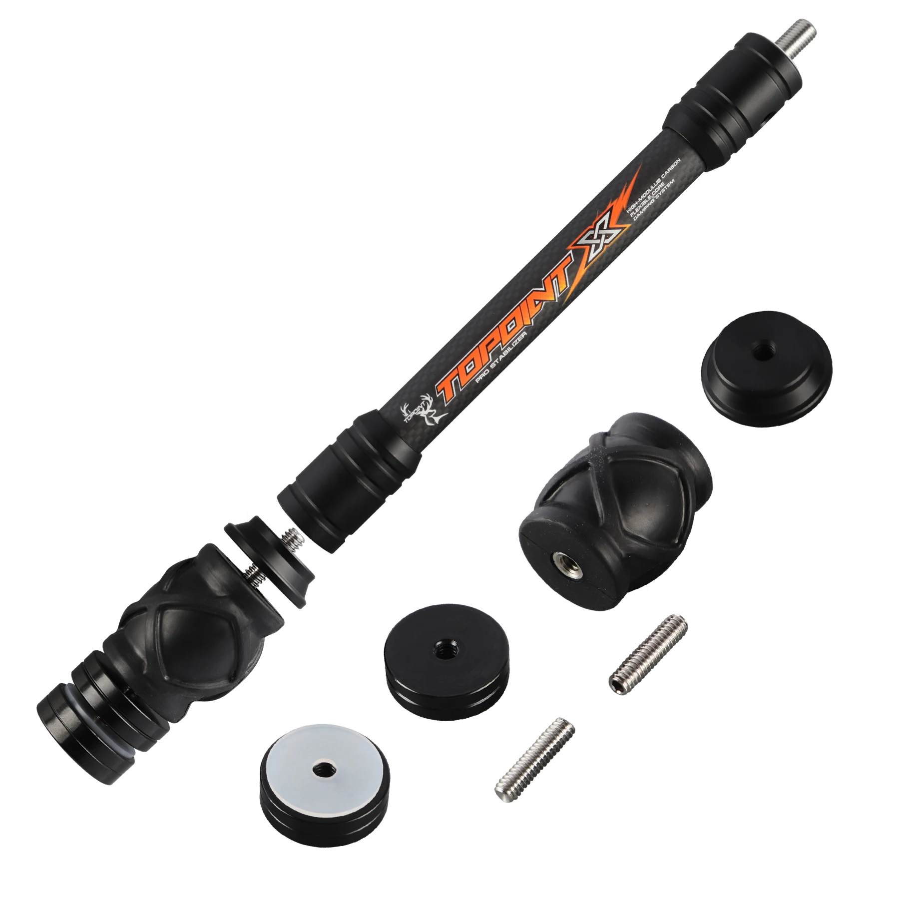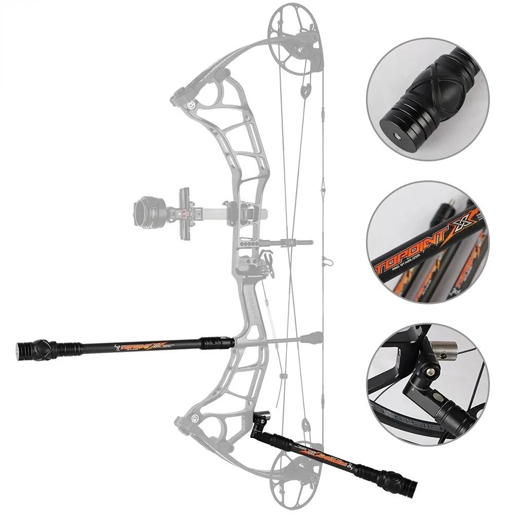 Características: 1.Se puede montar en el mango del arco. Tiene un efecto de absorción de impactos y puede reducir en gran medida la vibración del arco después de la implementación. 2.Diseño de rigidez optimizado que combina varillas de fibra de carbono 3K de alto módulo con tapas de extremo mecanizadas por CNC de precisión.Construcción duradera con excelente absorción de impactos. 3. Hilo 5/16''-24. Tamaño de hilo universal, adecuado para arcos recurvos y arcos compuestos para caza y competición.