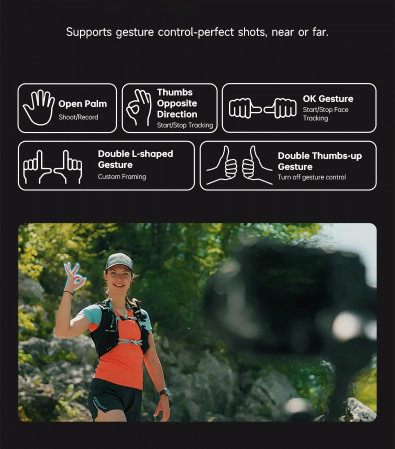 Experimente el futuro de la realización cinematográfica con la tecnología AI Tracking 4.0 que proporciona un seguimiento rápido y preciso del sujeto sin accesorios adicionales.El sistema de control de gestos intuitivo le permite controlar su cámara con simples movimientos de la mano: use la palma abierta para comenzar a grabar, un gesto OK para el seguimiento de la cara o los pulgares para controlar las funciones de seguimiento.Esto hace que el disparo en solitario sea increíblemente eficiente y profesional.