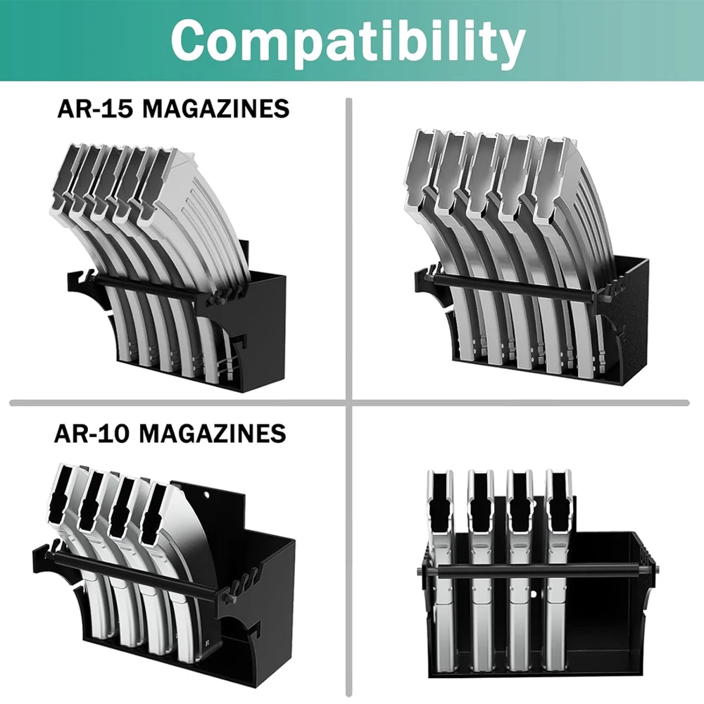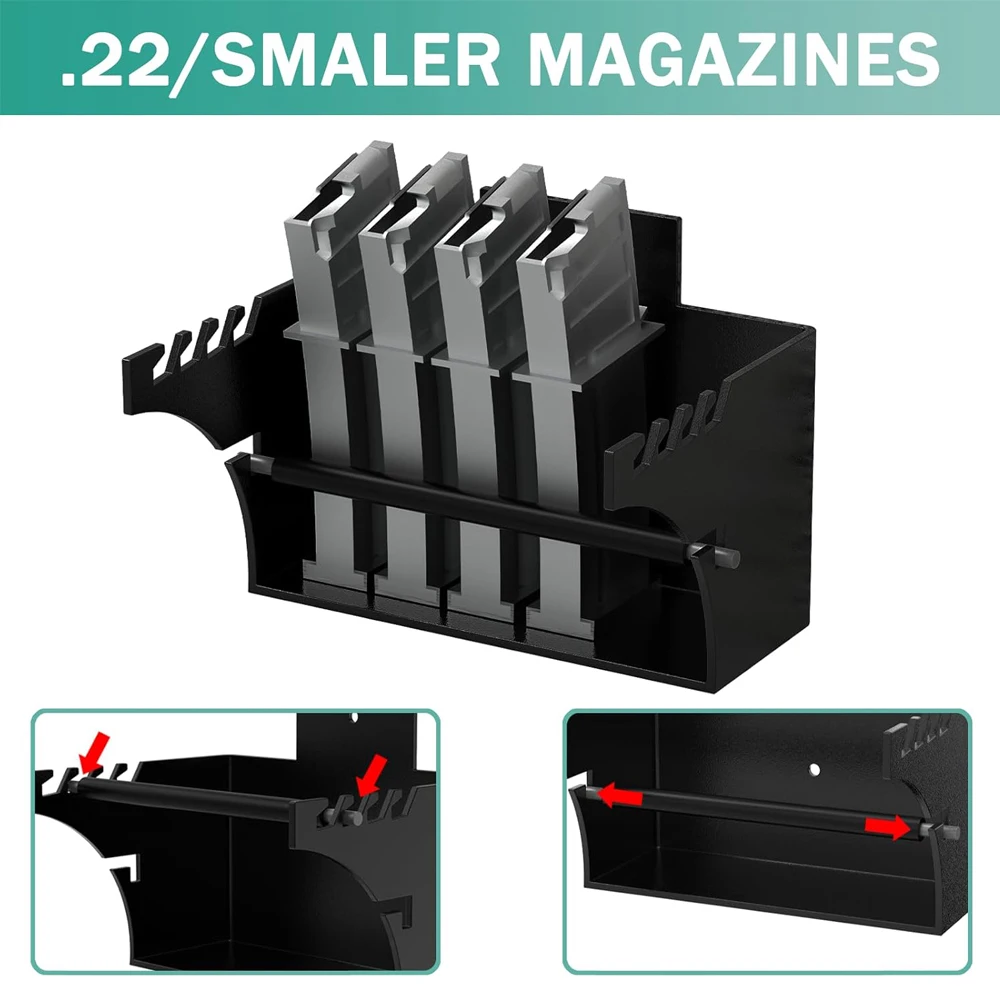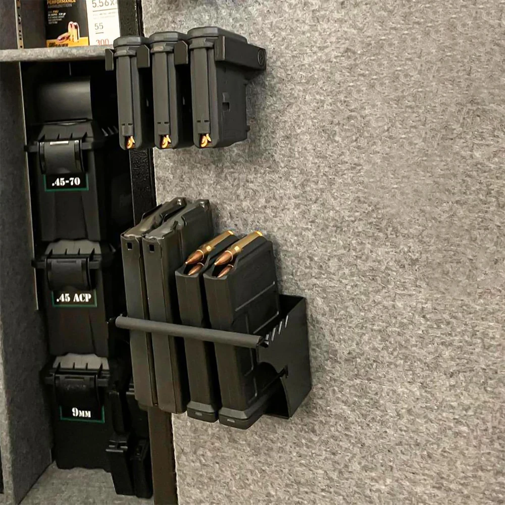 Se puede montar en cualquier superficie plana de su caja fuerte para armas, taller, armario, armario para armas, oficina o garaje.Se incluyen anclajes y tornillos para montaje en paneles de yeso, con una potencia nominal de hasta 15 libras.Cree un espacio de almacenamiento compacto para cargadores cargados o descargados en cualquier lugar junto con todos los accesorios de su arma.Un complemento esencial para tu kit de equipo táctico.