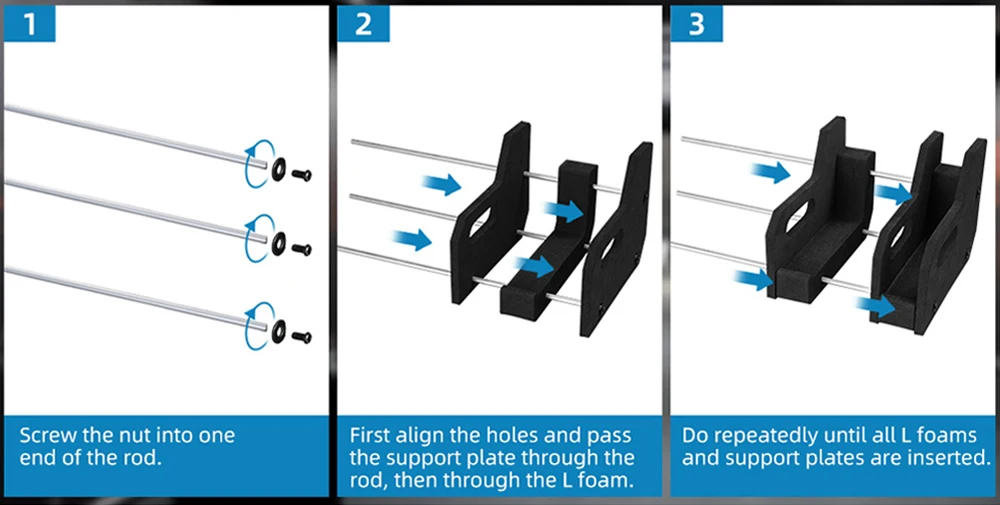 El soporte para pistola, hecho de espuma EVA flexible, puede contener varias pistolas, y cada ranura mide 1,5 pulgadas de ancho.Contiene largas varillas de fijación de acero inoxidable, lo que mejora la estabilidad y facilita el montaje.