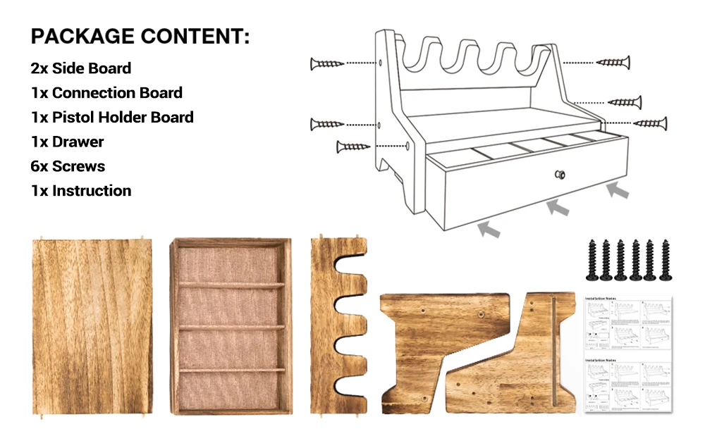Cada ranura para pistola mide 1,3 pulgadas de ancho y se adapta a la mayoría de las pistolas del mercado.Cajón de almacenamiento adicional almacena mejor revistas y balas.