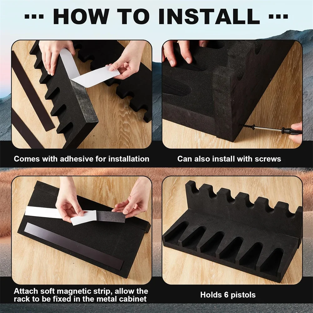 El apoyo para rifles es fácil de montar, la tira de esponja está diseñada con una tira magnética suave en su parte posterior, que puede ayudar a que las pistolas se fijen en el gabinete, también puede fijarse con tornillos, manteniendo así la pistola estable después de la instalación, y el resto puede ser cortado a su tamaño, brindándole una experiencia de uso conveniente.