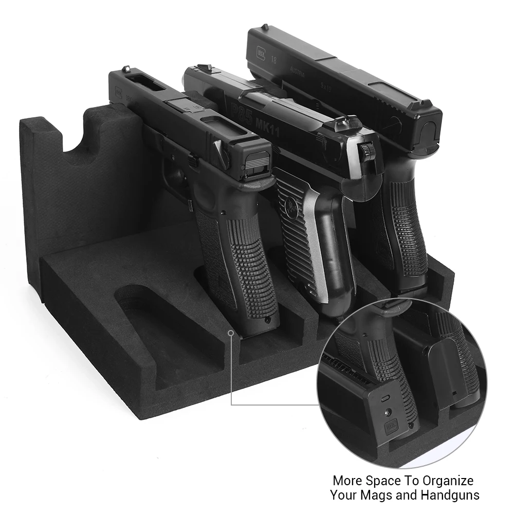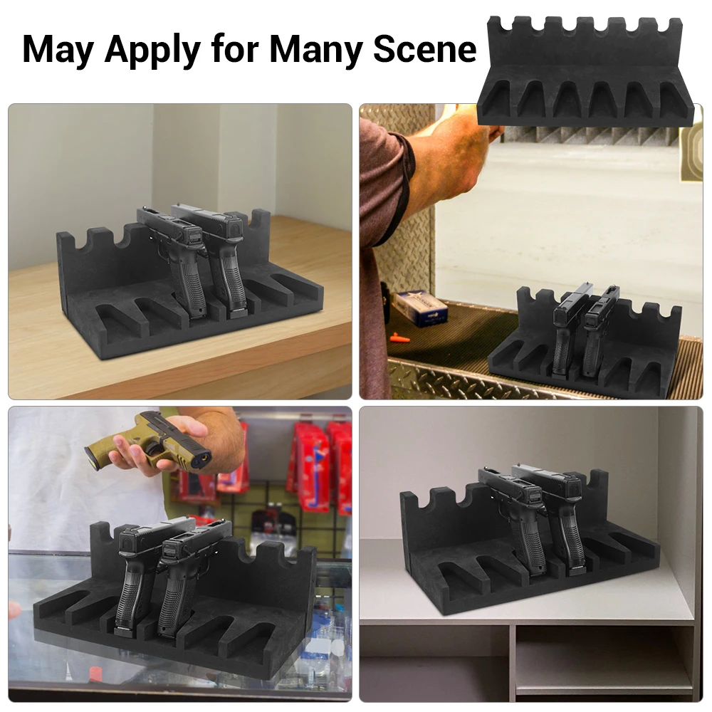 El soporte para pistolas está hecho de material EVA de alta calidad, mejorado y respetuoso con el medio ambiente, que es resistente a la humedad y proporciona una protección eficaz para el cuerpo de la pistola contra rasguños, garantizando la seguridad de las armas de fuego.