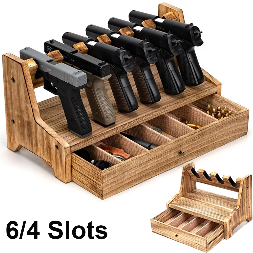 1. 【Almacenamiento ordenado】 El estante para pistolas tiene 6/4 ranuras en forma de U para almacenamiento y cajones adicionales que se utilizan para colocar equipos y accesorios tácticos de pistola. No solo puede ayudarlo a encontrar las cosas rápidamente, sino que también mantiene el ambiente limpio y cómodo..