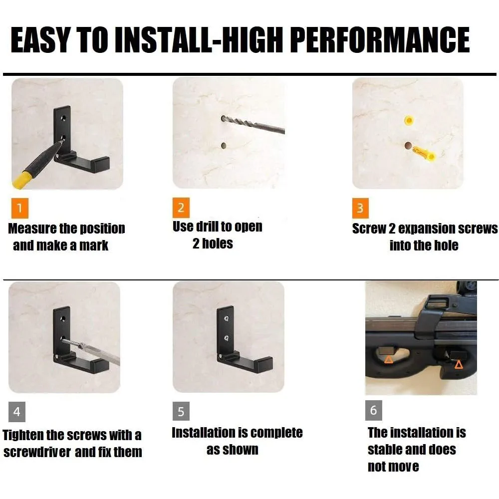 Montar su arma tarda solo 5 minutos, es muy fácil de instalar, se unen tramos y anclajes de tornillo, directamente atornillados en las paredes para colgar en cualquier lugar.Son muy resistentes, por lo que incluso se pueden colgar objetos pesados, por lo que no tiene que preocuparse de que el arma se caiga o se golpee.