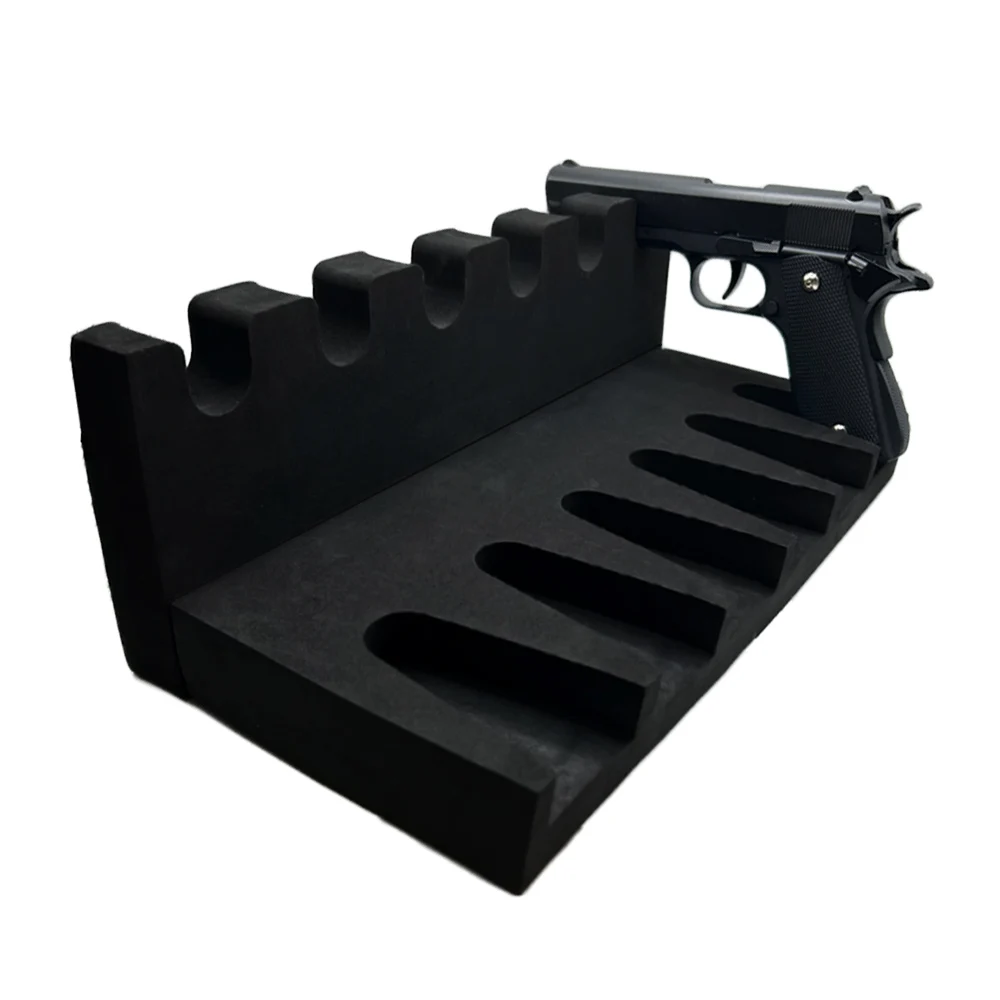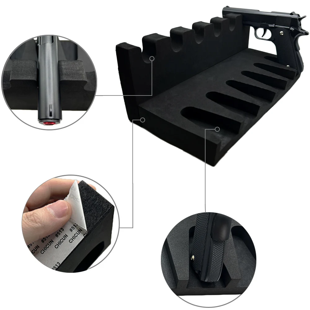 1. El estante de pistola puede almacenar 6 pistolas y es adecuado para varias pistolas. Es una solución de almacenamiento perfecta para un espacio limitado en armarios de armas o escritorios.Especificación:
