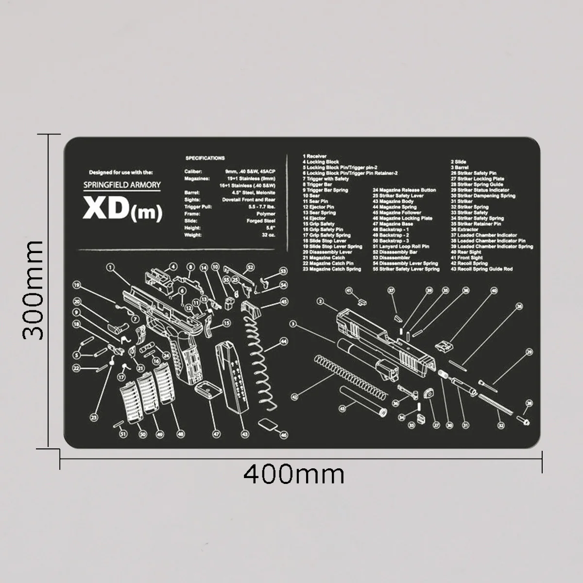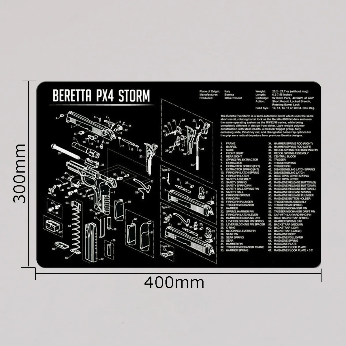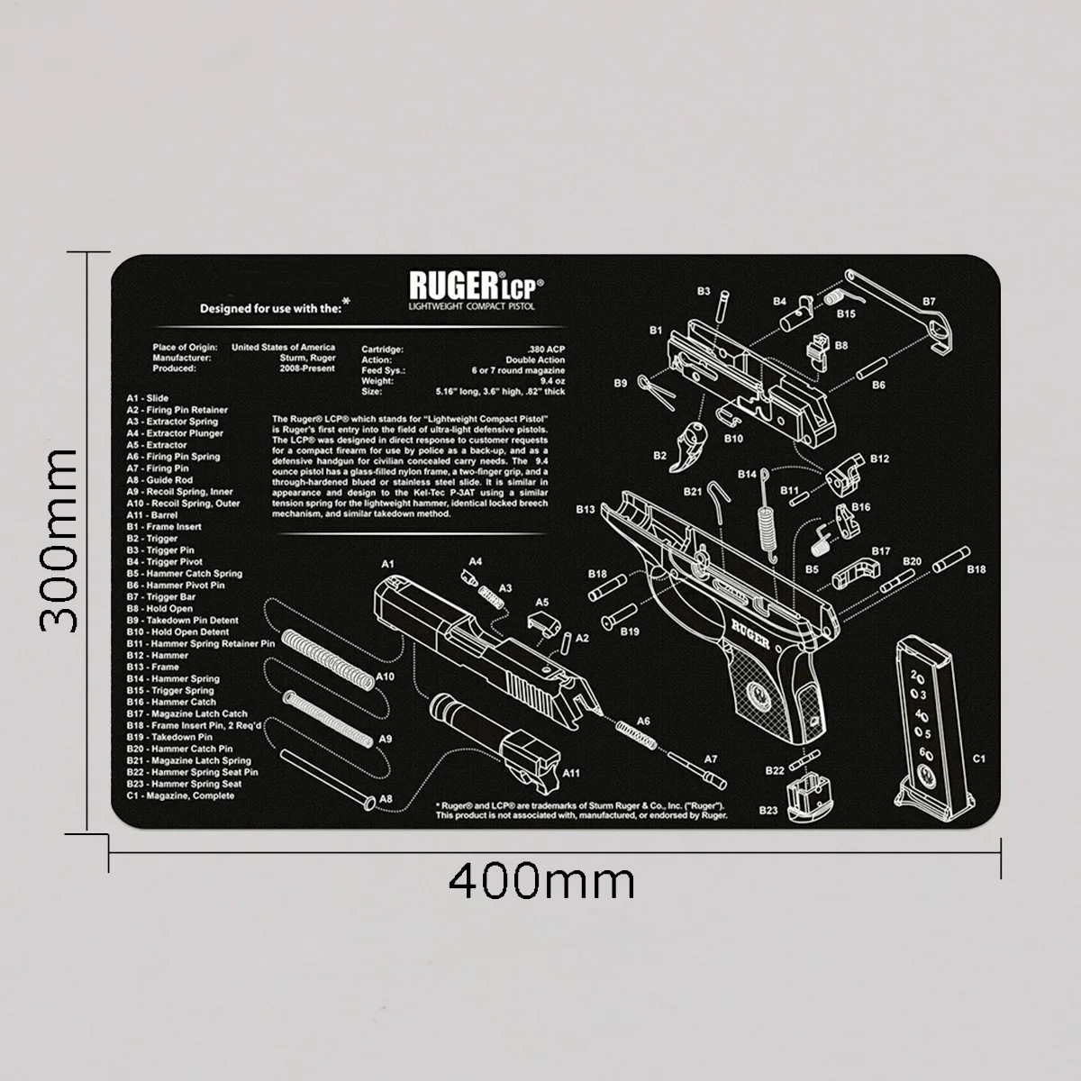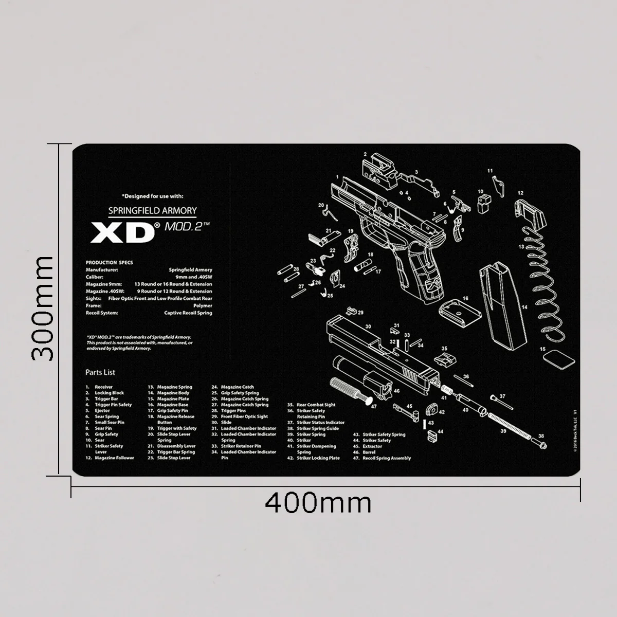 Característica: 1. Proteja su arma y su área de trabajo: la suave superficie de fibra termoplástica garantiza que su arma no se raye, mientras que la parte posterior de neopreno de caucho de 3 mm de espesor protegerá su superficie de trabajo y evitará que la alfombra se resbale 2. Pistola de limpieza de alfombras de calidad: esta pistola de limpieza Glock Moquette de Tekmat está fabricada según un estándar exigente que comienza con cero resistencia al agua y al aceite de impresión por sublimación cuyas fibras durarán toda la vida. 3.Fácil de usar: esta alfombra de limpieza para pistola viene con una descripción general de la historia de la pistola, así como un diagrama de piezas simple de seguir que representa su pistola y rueda para un fácil almacenamiento.