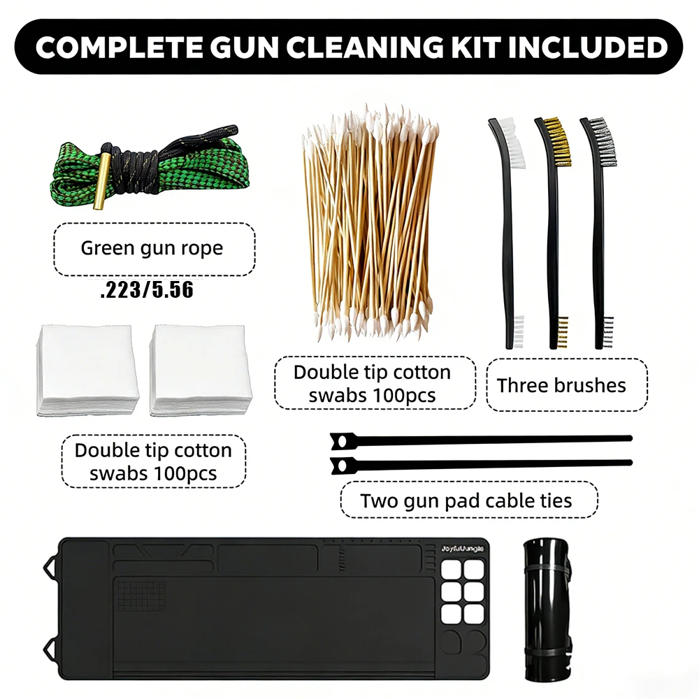 Todo lo que necesita en un solo paquete: 1 alfombrilla de limpieza para armas grandes, 3 cepillos de limpieza para armas, 100 hisopos de limpieza para armas, 100 parches de limpieza para armas, 1 cuerda de limpieza para armas de 5,56 mm, 2 bridas para cables para almohadillas para armas.