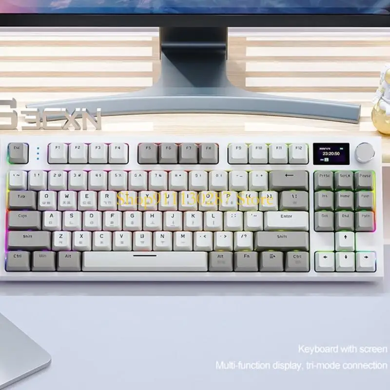 Características:OOTDTYLos interruptores de teclado coreano de tres modos K86RGB son un teclado mecánico que combina las características de un teclado normal con conectividad de tres modos y visualización inteligente en pantalla a color.