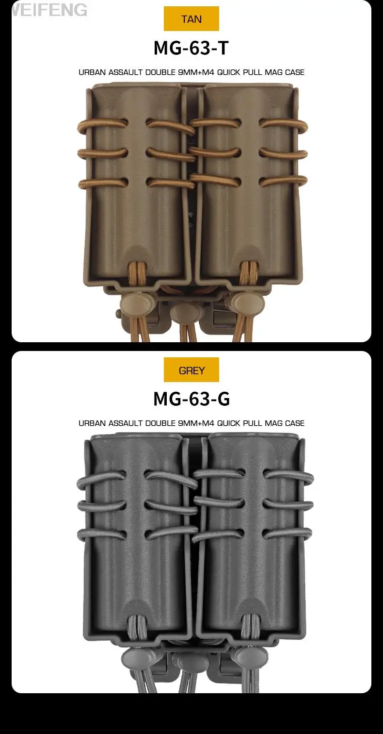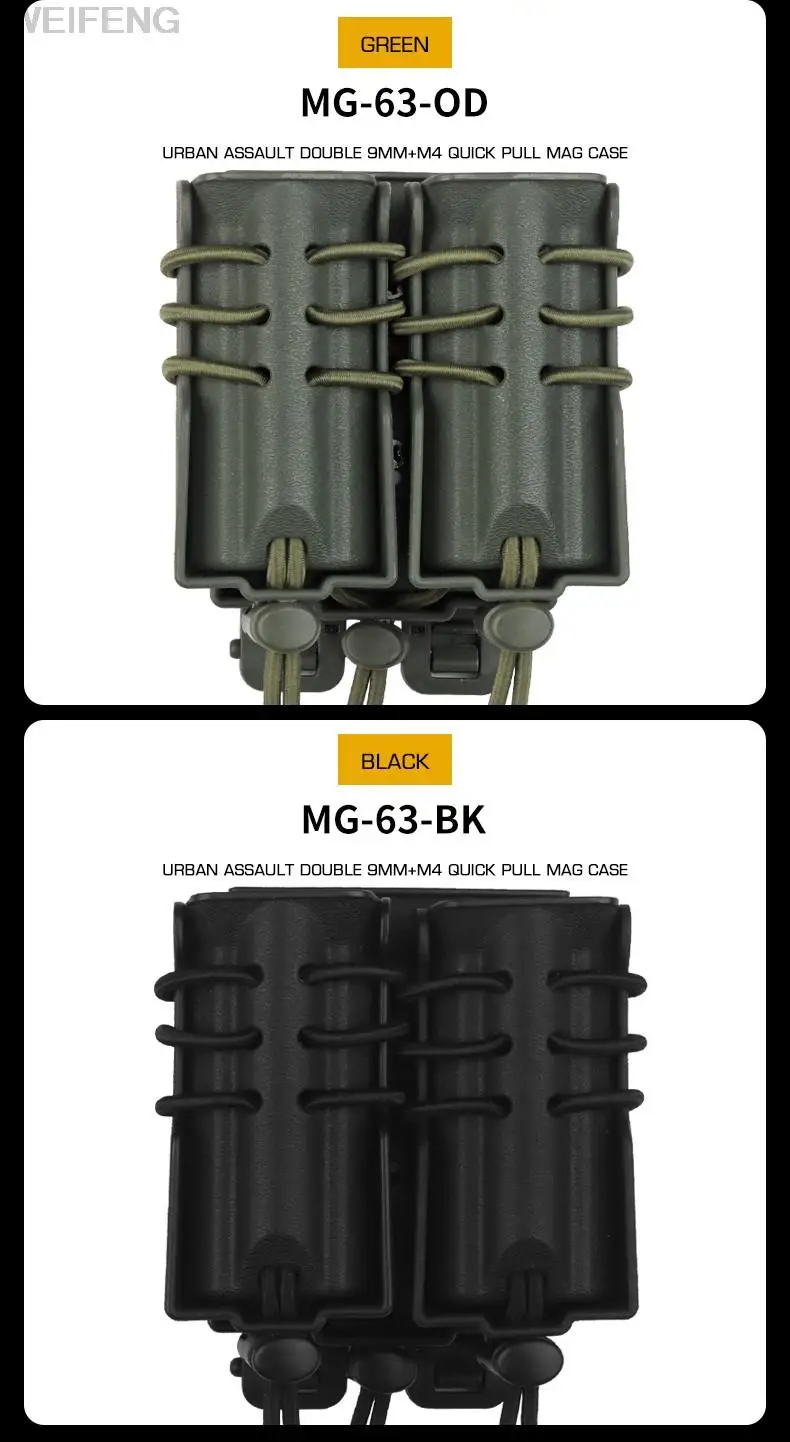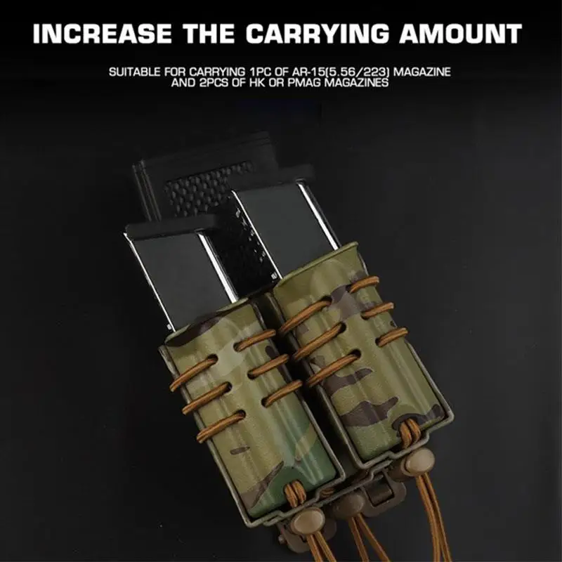 Nombre: bolsa táctica para cargador doble de 9mm y 5,56mm. Color: negro, verde, marrón, gris, CP,BCP. Peso: 260g. Material:nylon + tela elástica.