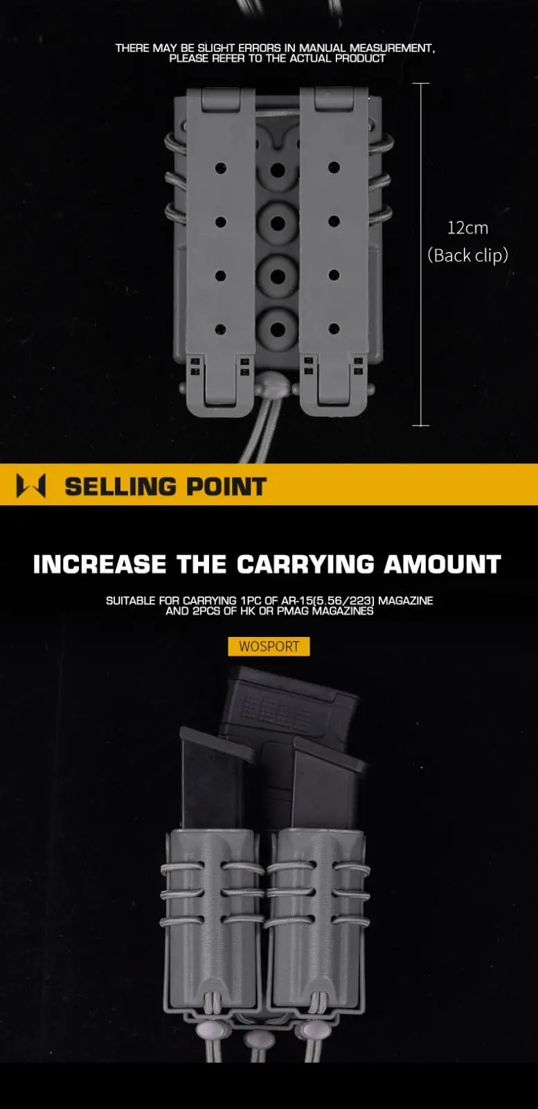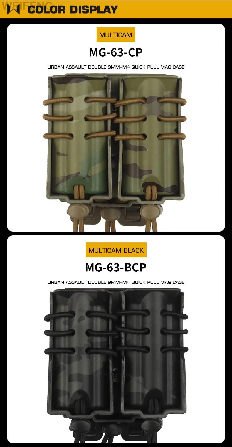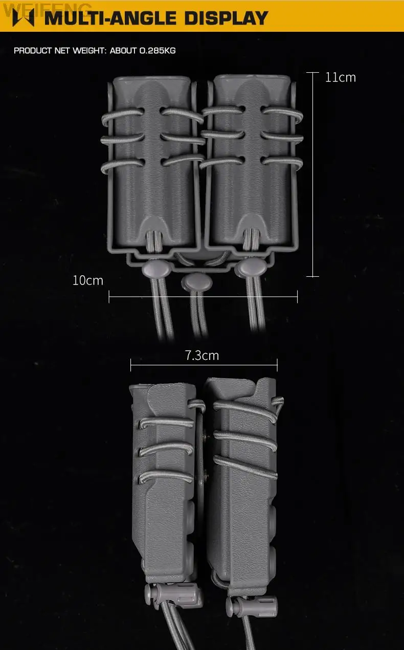 Nombre: bolsa táctica para cargador doble de 9mm y 5,56mm. Color: negro, verde, marrón, gris, CP,BCP. Peso: 260g. Material:nylon + tela elástica.