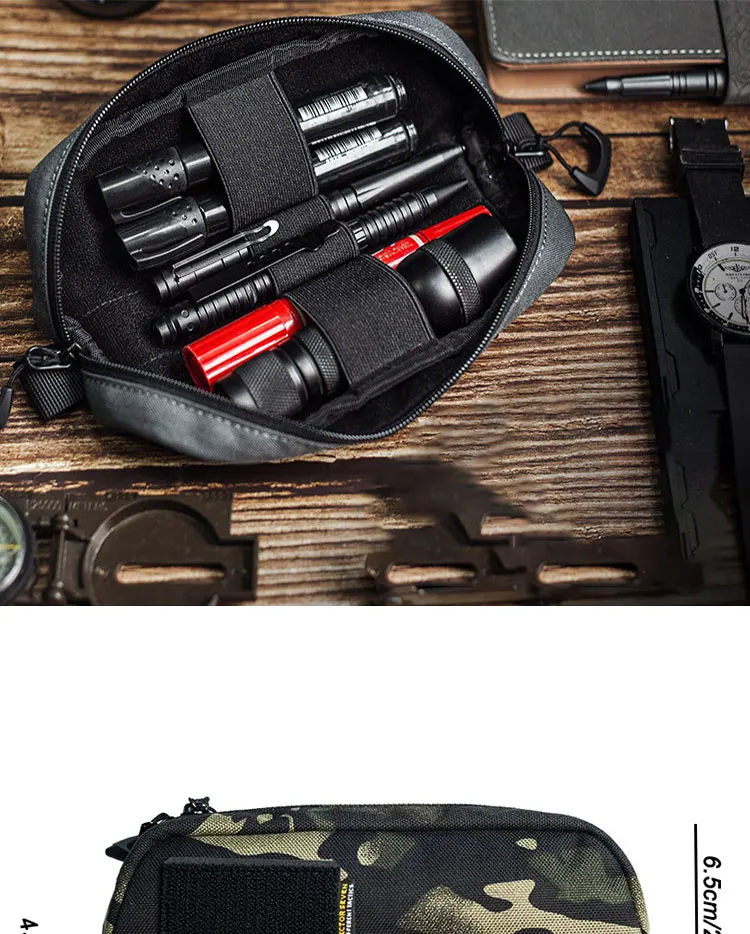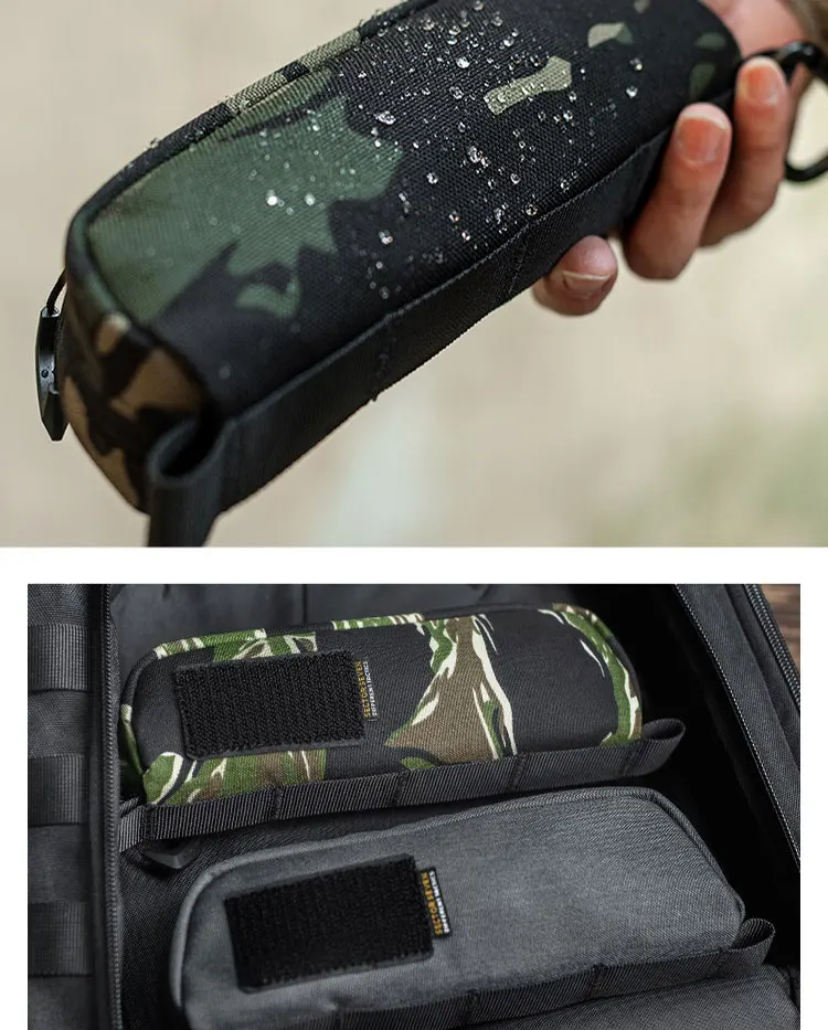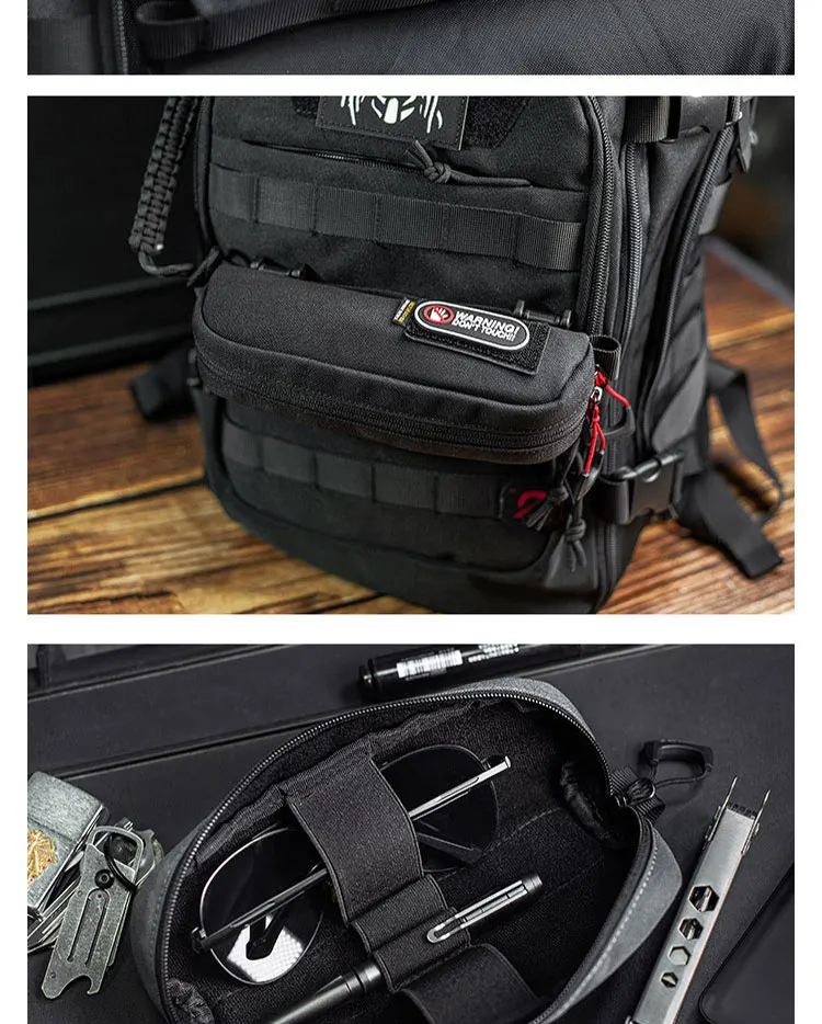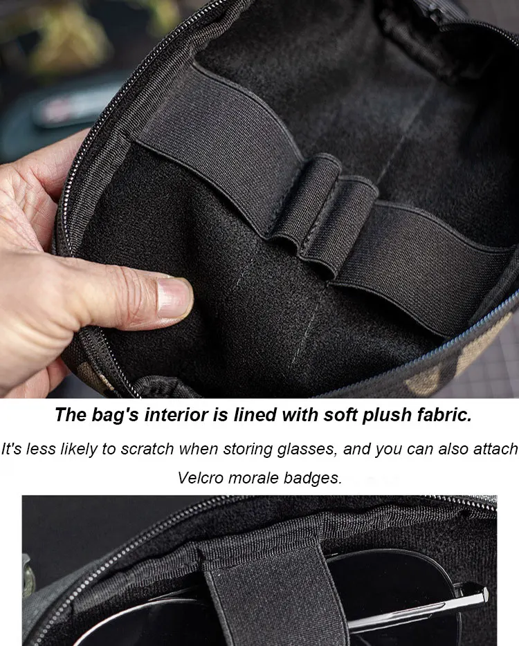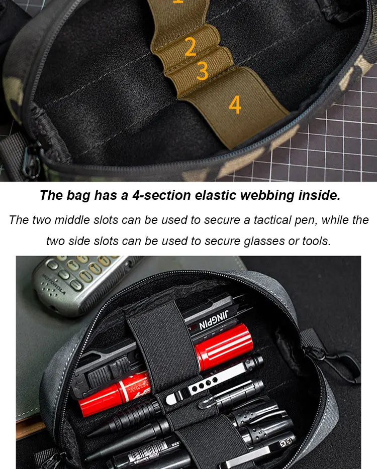 La bolsa cuenta con una correa elástica de 4 ranuras en el interior; las dos ranuras centrales pueden contener un bolígrafo táctico, mientras que las dos ranuras laterales pueden contener gafas o herramientas tácticas.El exterior cuenta con velcro para adherir parches de moral personalizados.