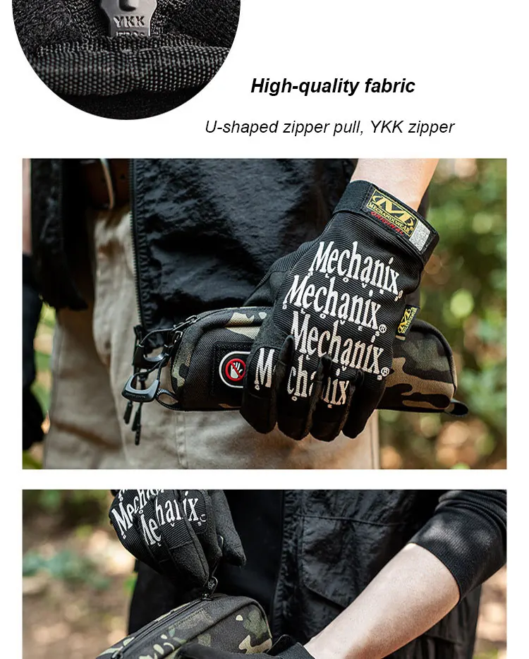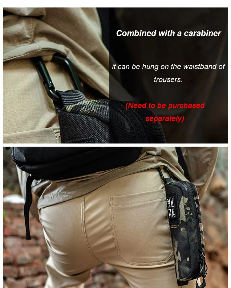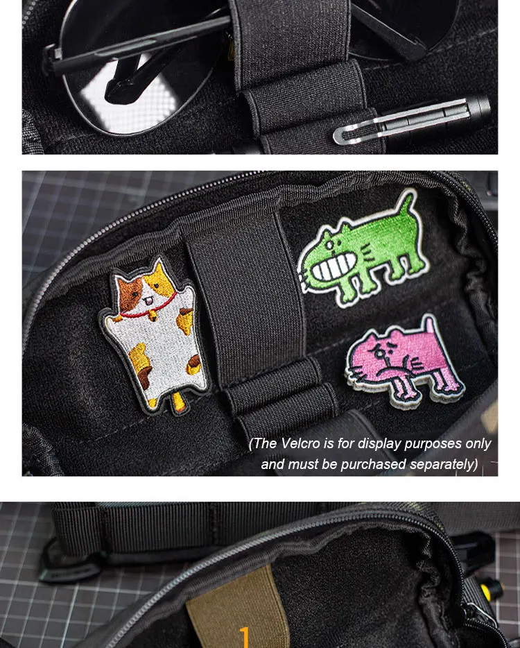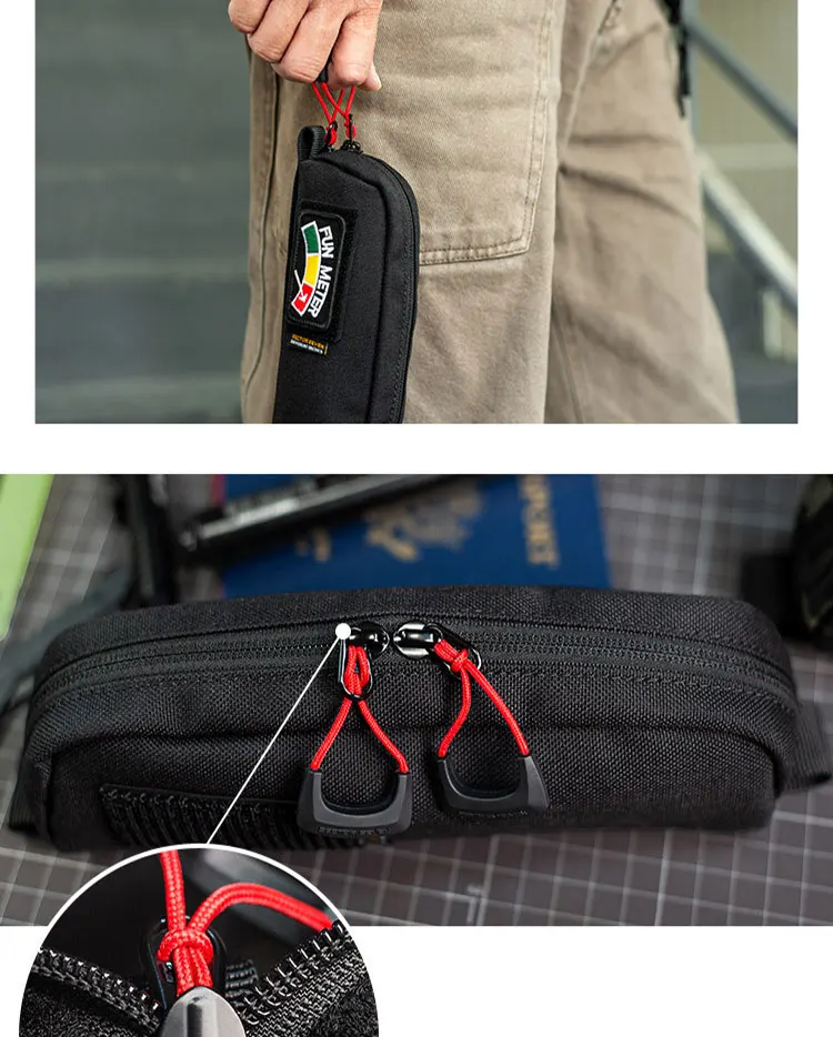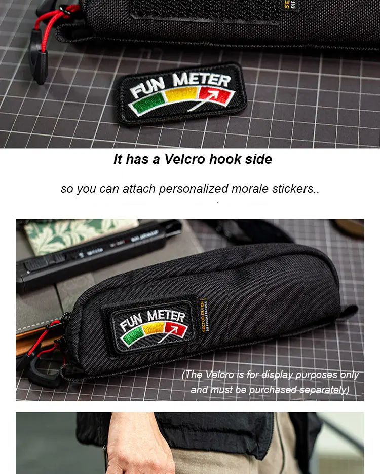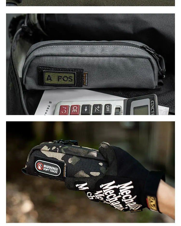 La bolsa cuenta con una correa elástica de 4 ranuras en el interior; las dos ranuras centrales pueden contener un bolígrafo táctico, mientras que las dos ranuras laterales pueden contener gafas o herramientas tácticas.El exterior cuenta con velcro para adherir parches de moral personalizados.