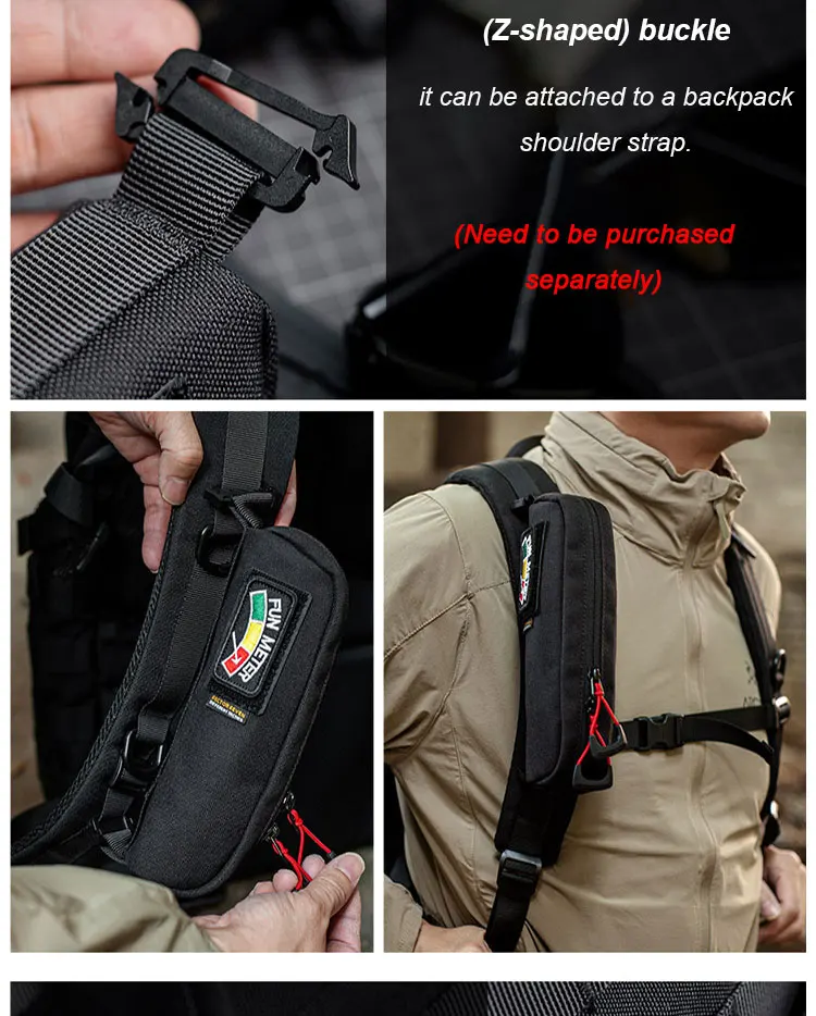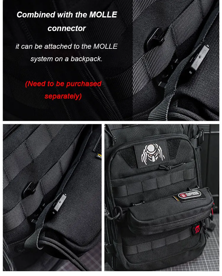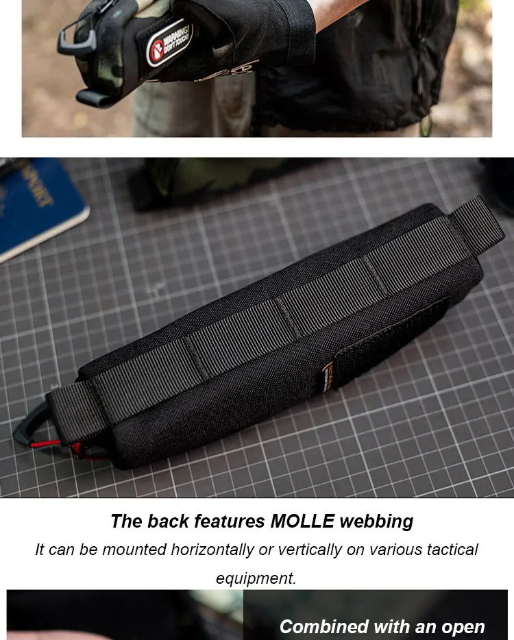 Se puede conectar al sistema MOLLE y sujetar a varias bolsas tácticas, correas de hombro de mochilas y cinturillas (los accesorios se venden por separado).Especificaciones: