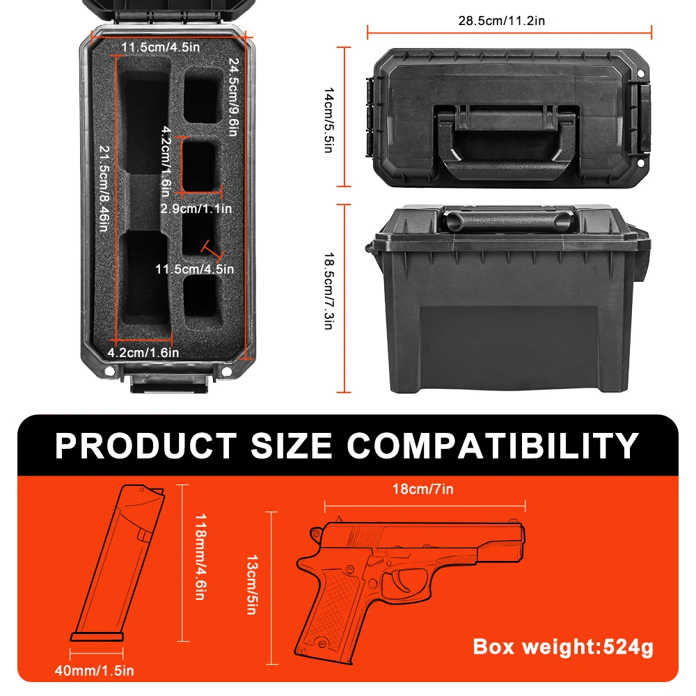 3.El revestimiento universal puede acomodar una pistola y cuatro cargadores, adecuado para Taurus, Glock, 1911 y otros tipos de armas. Y la caja vacía puede almacenar municiones para pistolas, rifles y escopetas.