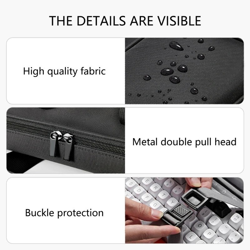 La capa exterior utiliza tela duradera y resistente al agua, mientras que el forro interior emplea una l suave para evitar eficazmente rayones e impactos accidentales en los teclados.