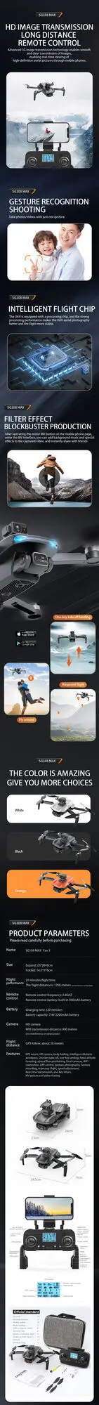 Two-axis anti-shake gimbal,GPS return to home,4K HD camera,folding body, One key to take off, one key to land,fixed heighthover, optical flow fixed height,dual cameras, WiFi connection,APP control, gesture photo, gesture video, image follow,