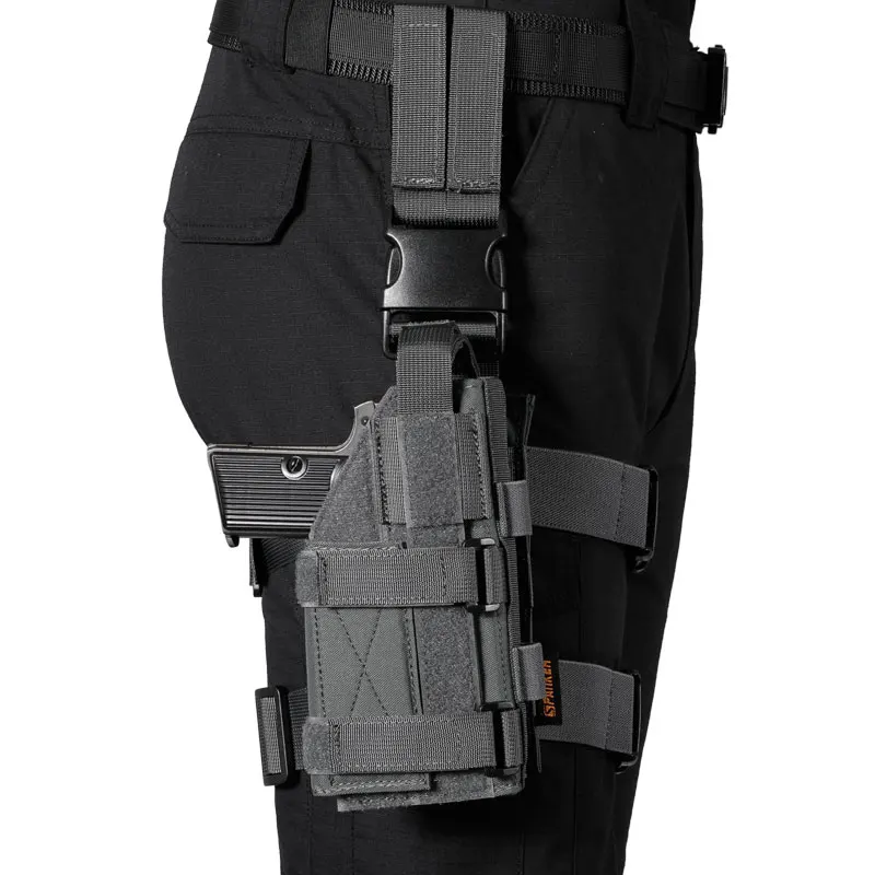 Esta es una mini funda de pistola de pierna con un panel de pierna a prueba de caídas y una funda RH.