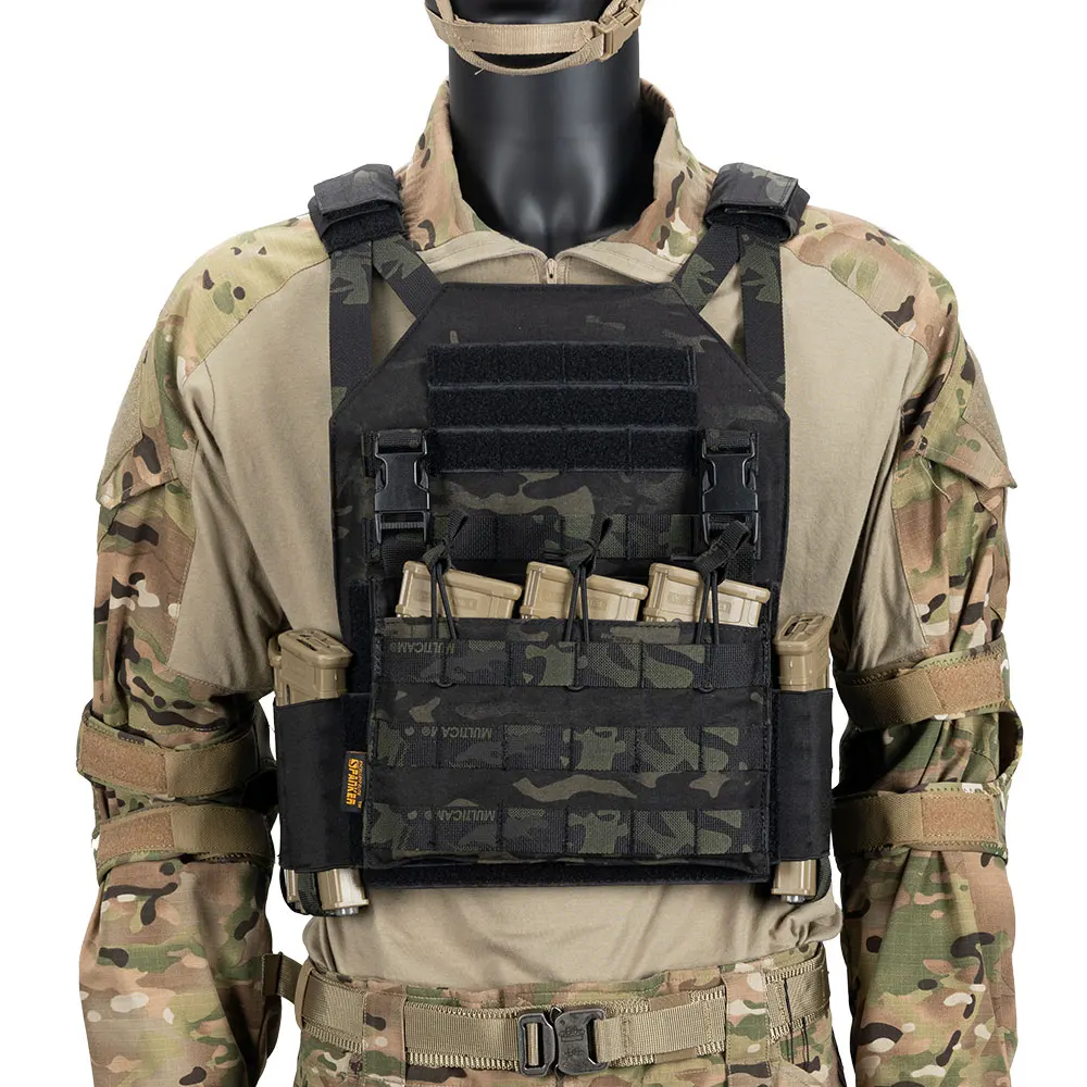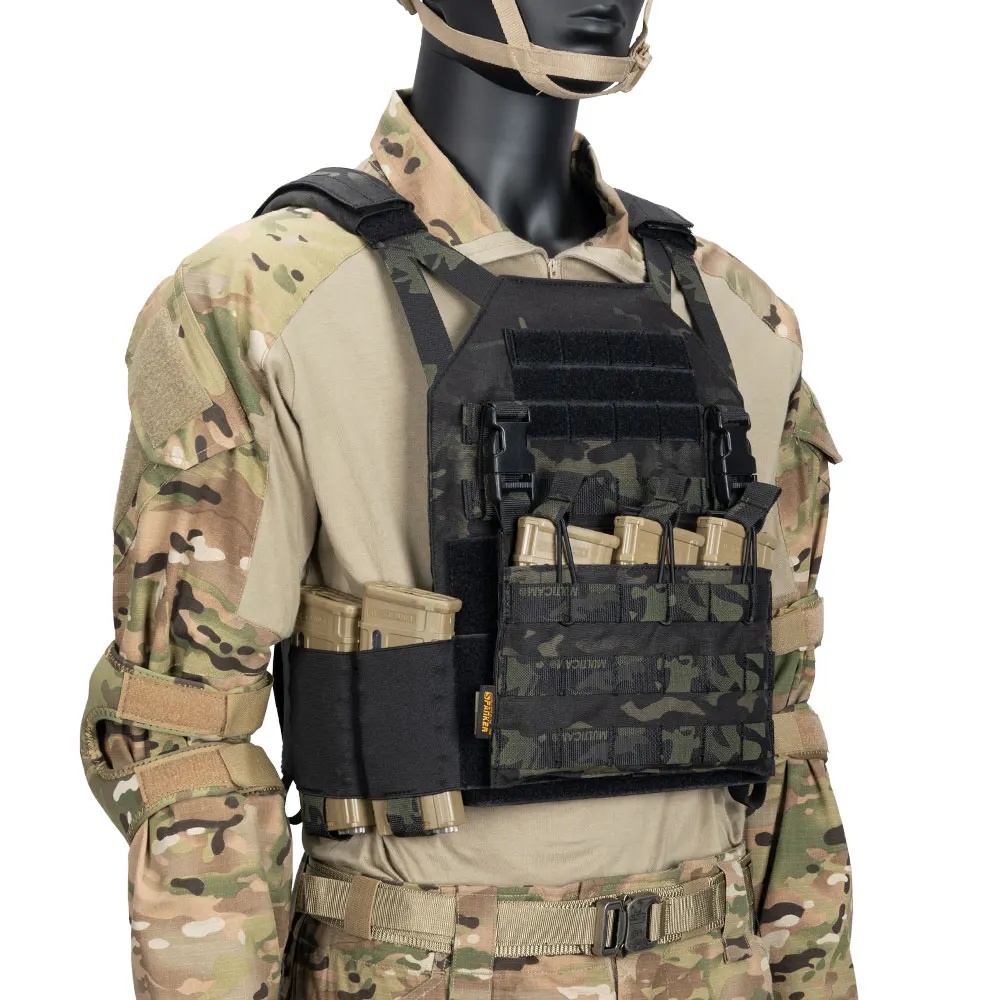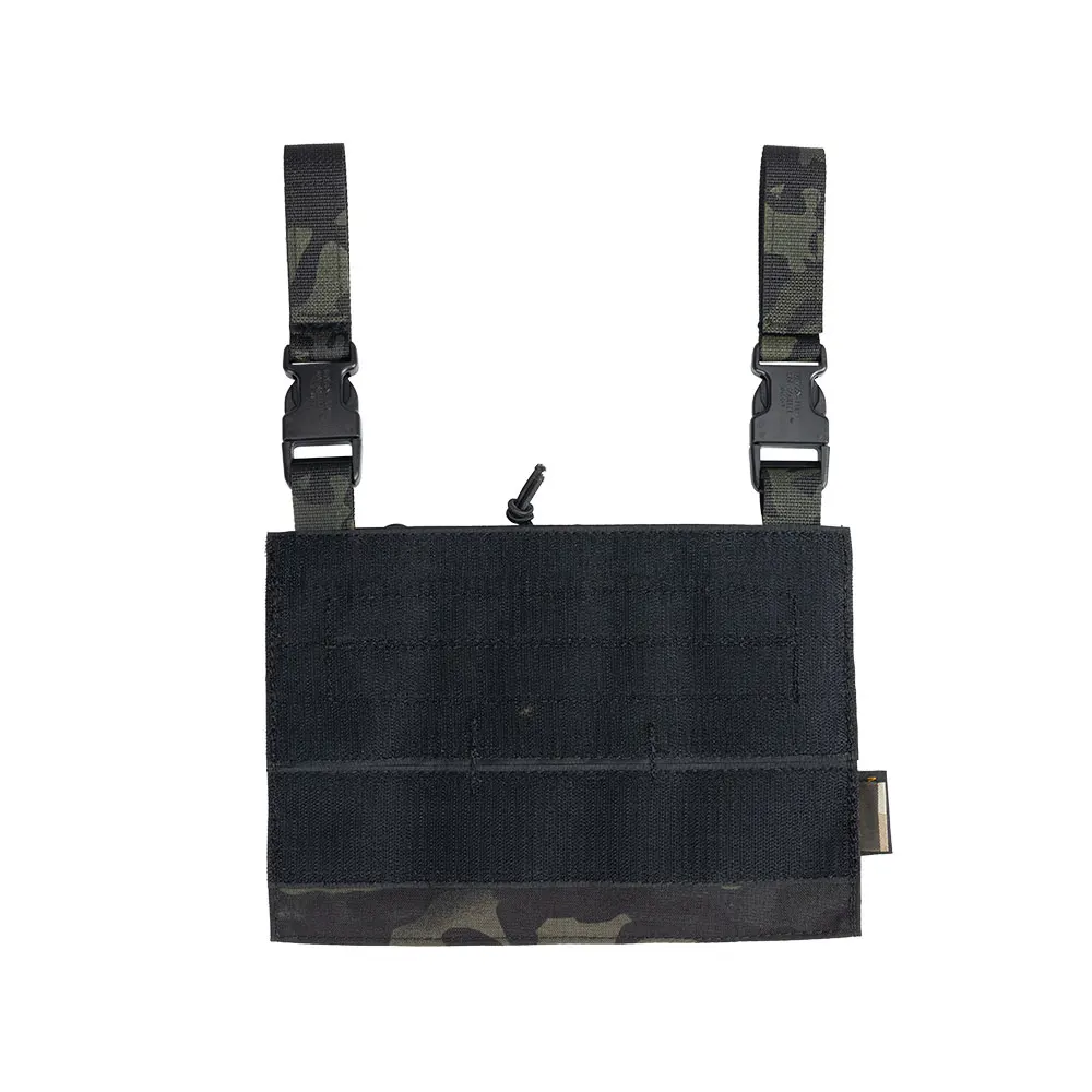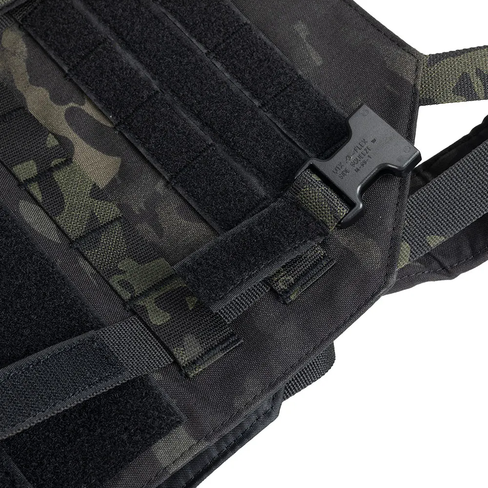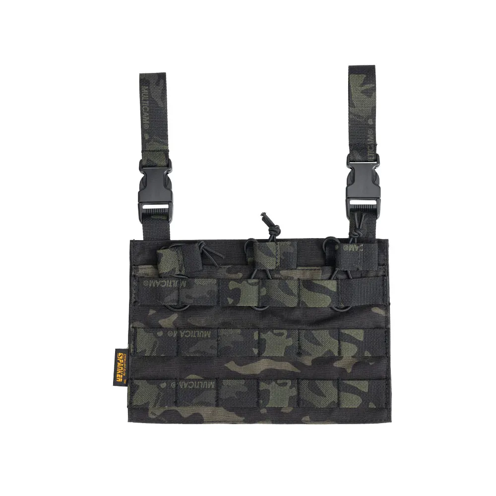 Chaleco táctico delante de la composición mediante el panel mágico que se puede acoplar al módulo de algunas revistas. La parte posterior del chaleco está formada por el sistema MOLLE, que se puede acoplar a algún otro equipo pequeño.