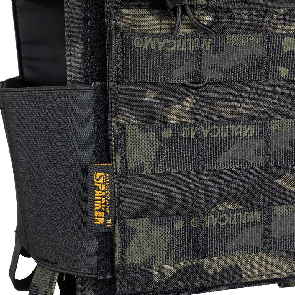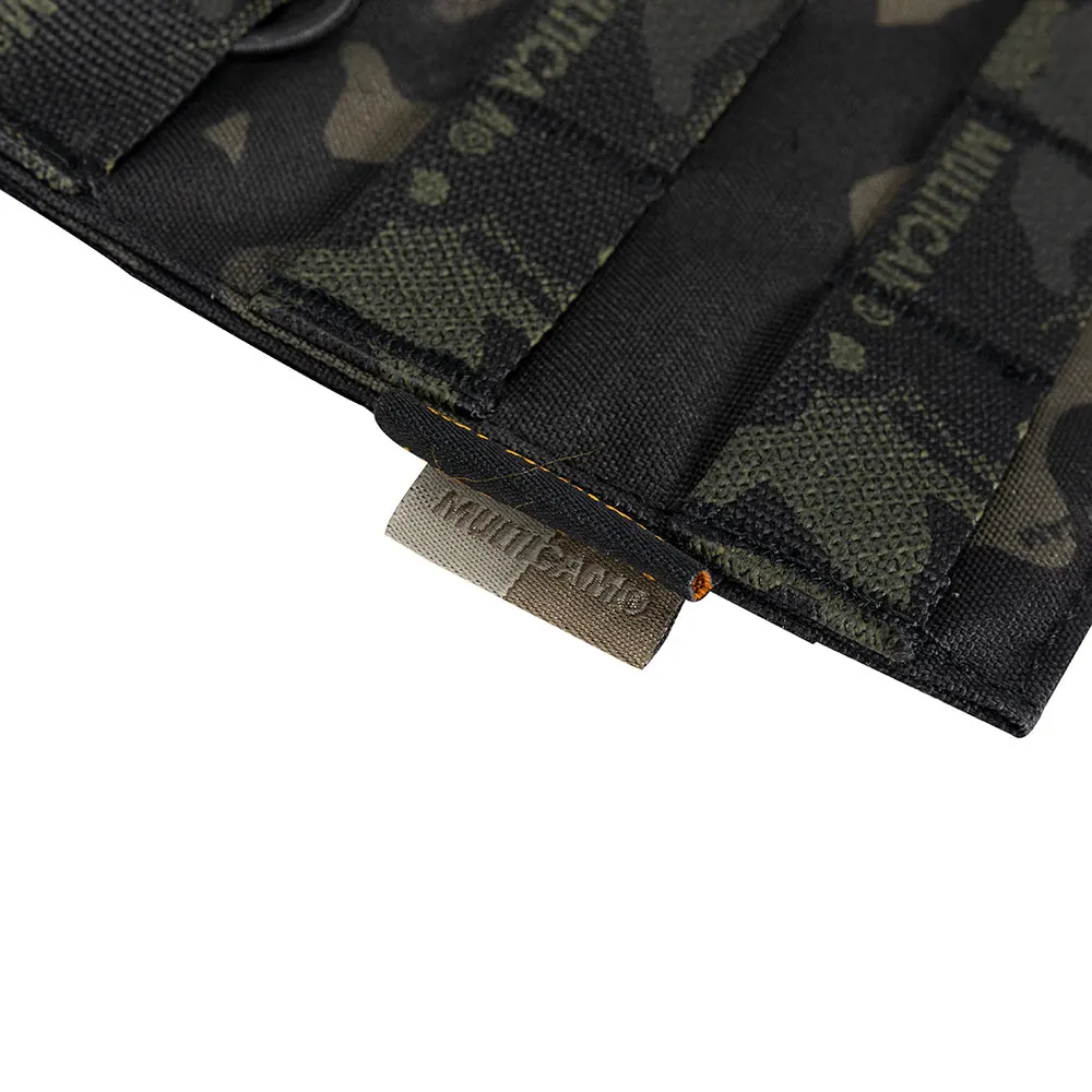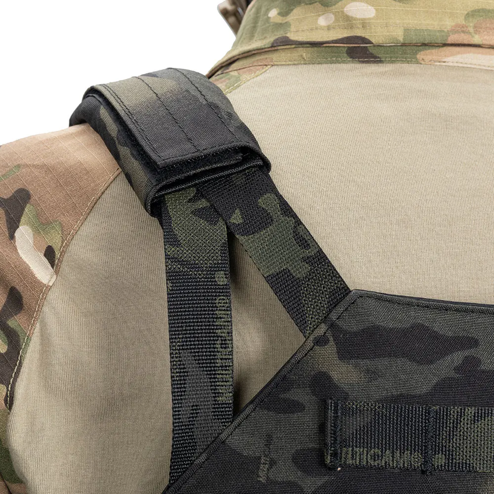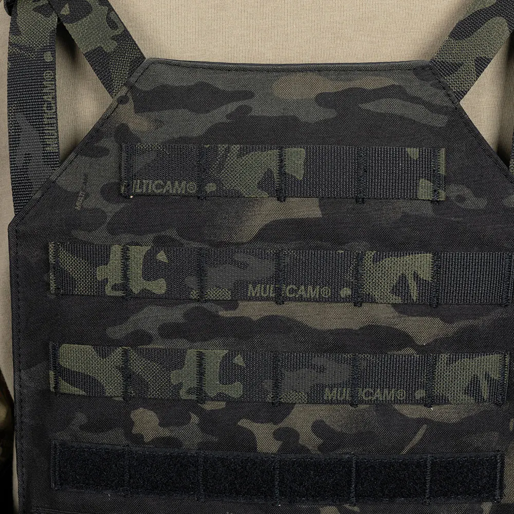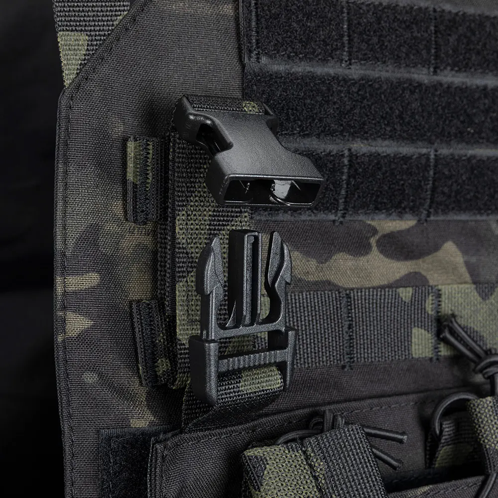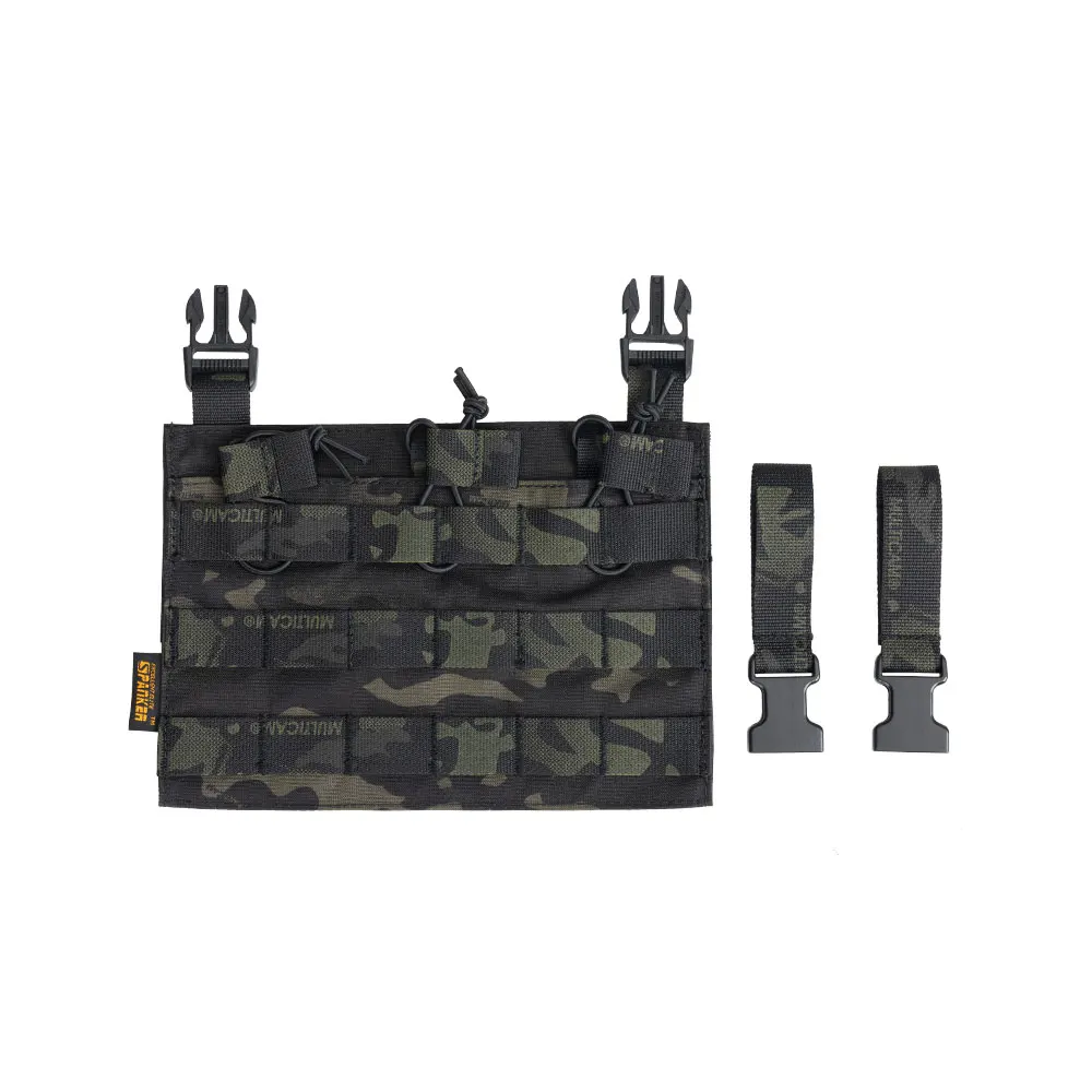 Chaleco táctico delante de la composición mediante el panel mágico que se puede acoplar al módulo de algunas revistas. La parte posterior del chaleco está formada por el sistema MOLLE, que se puede acoplar a algún otro equipo pequeño.