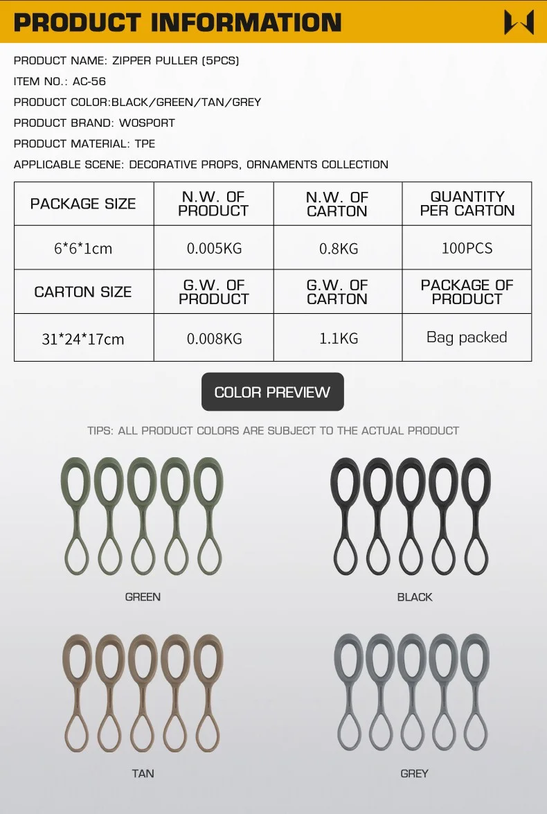 Descripción del producto: Nombre del producto: Anillo de tracción con cremallera (5) Color del producto: Negro/verde/marrón/gris Material del producto: TPE Escena aplicable: accesorios decorativos, colección de joyas.
