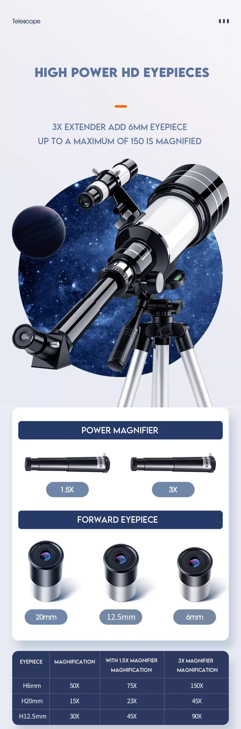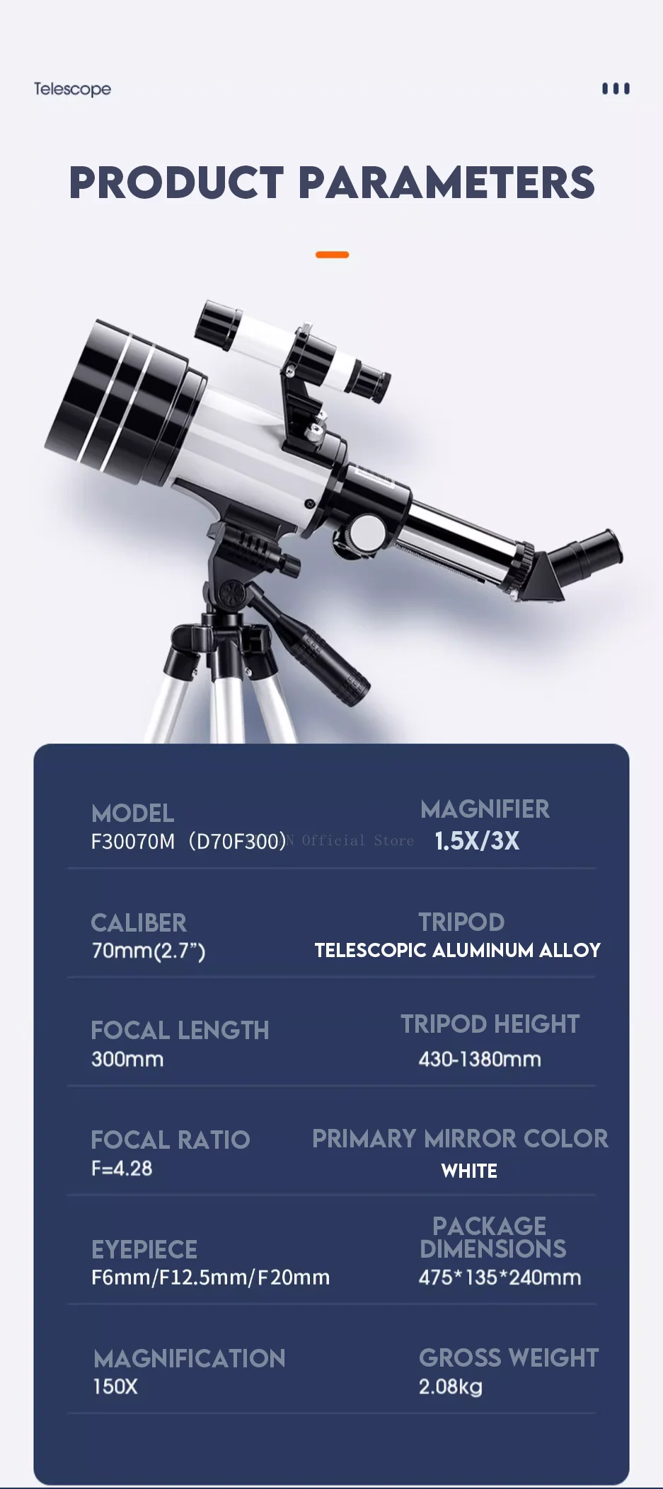 Telescopio astronómico profesional de longitud focal de 300MM para espacio, ocular de 70MM, binoculares monoculares potentes Moon Star Mars