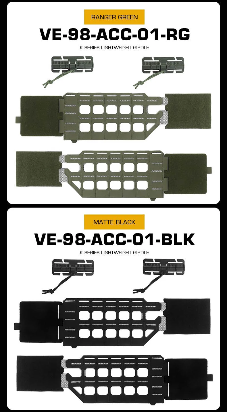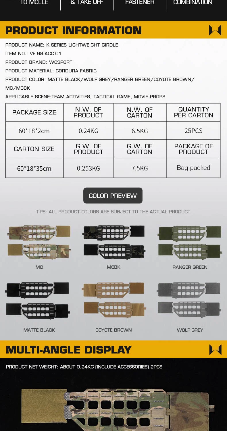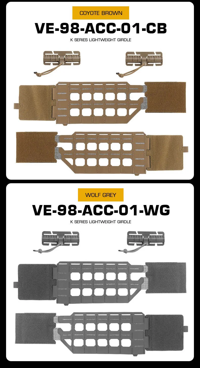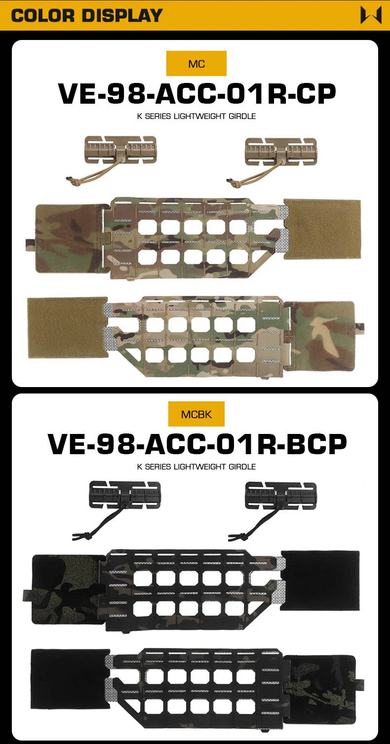 Nombre del producto: faja ligera serie K Número de artículo.:VE-98-ACC-01 Tamaño del producto: 60*18*2cm Peso neto del producto: 0,24 KG Color del producto: negro mate/gris lobo/verde Ranger/marrón coyote/multicam/multicam negro Escena aplicable: actividades del equipo. Material principal: Cordura